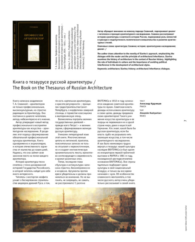 Автор обращает внимание на новизну подхода Славиной, подчеркивает диалог с читателем и принцип архитектурного наследования. Славина рассматривает историю архитектуры в контексте истории России, подчеркивая роль личностей в культуре и недопустимость политического вмешательства в развитие архитектурных стилей.