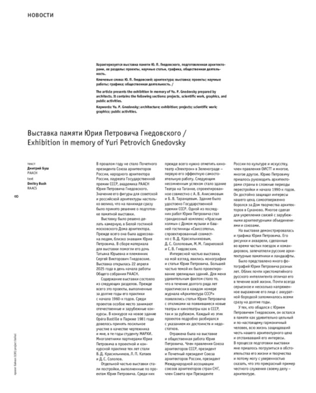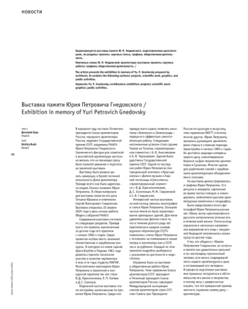 Характеризуется выставка памяти Ю. П. Гнедовского, подготовленная архитекторами, ее разделы: проекты, научные статьи, графика, общественная деятельность.