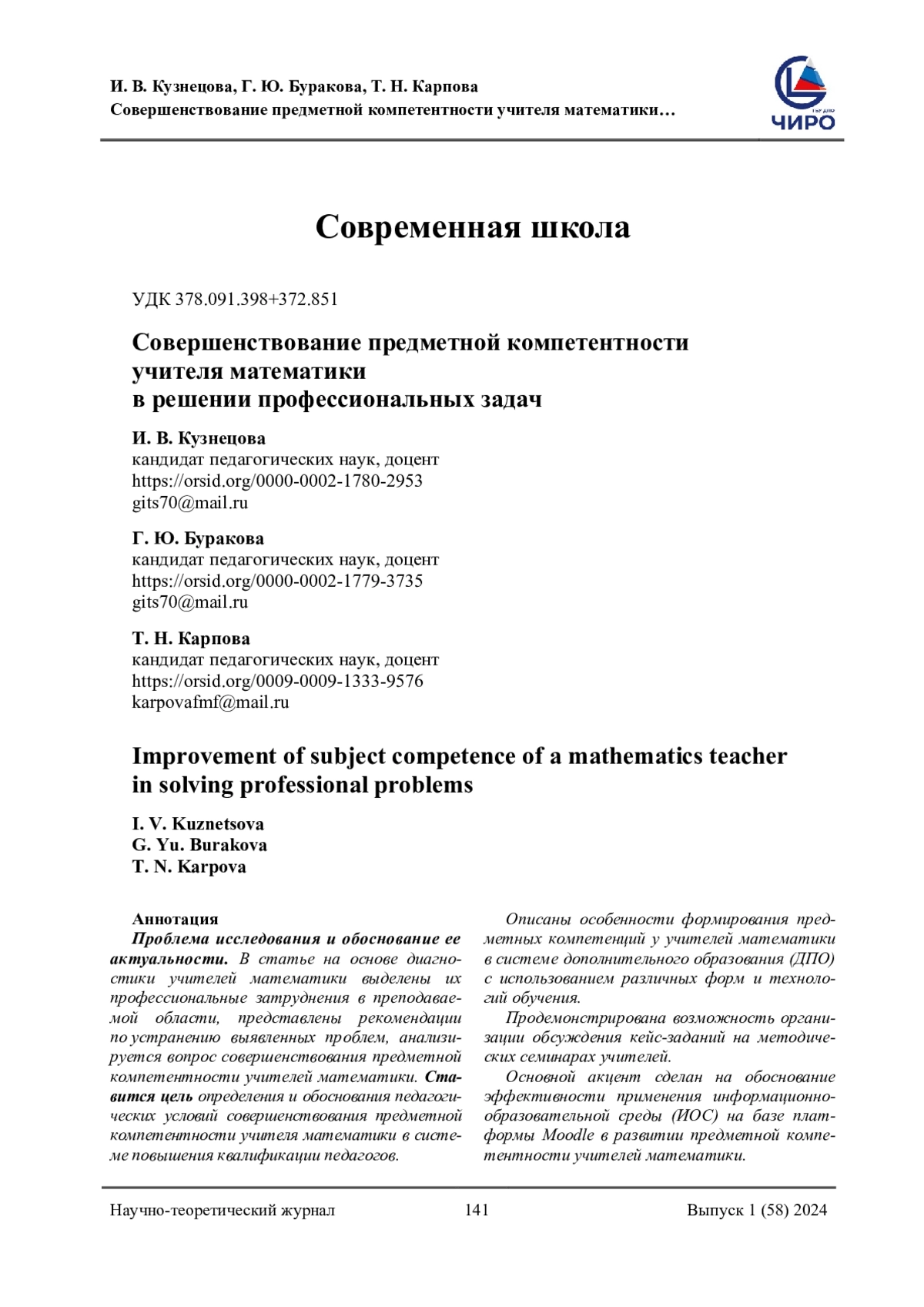 Проблема исследования и обоснование ее актуальности. В статье на основе диагностики учителей математики выделены их профессиональные затруднения в преподаваемой области, представлены рекомендации по устранению выявленных проблем, анализируется вопрос совершенствования предметной компетентности учителей математики. Ставится цель определения и обоснования педагогических условий совершенствования предметной компетентности учителя математики в системе повышения квалификации педагогов. Описаны особенности формирования предметных компетенций у учителей математики в системе дополнительного образования (ДПО) с использованием различных форм и технологий обучения. Продемонстрирована возможность организации обсуждения кейс-заданий на методических семинарах учителей. Основной акцент сделан на обоснование эффективности применения информационно-образовательной среды (ИОС) на базе платформы Moodle в развитии предметной компетентности учителей математики. Методологической основой исследования выступают положения компетентностного подхода в образовании, согласно которому возникает потребность формирования у учителей необходимых компетенций, и, как следствие, создание специальной системы подготовки и переподготовки педагогических кадров. Отмечается необходимость использования синергетического подхода, обусловленная осмыслением и переосмыслением содержания предметного знания, соотнесением его сущности с актуальными значениями, установлением причинно-следственных и интуитивных связей учителями математики в рамках системы дополнительного образования. Описание результатов связывается с характеристикой профессиональных дефицитов учителей математики и возможными путями их устранения в рамках системы ДПО педагогов на основе использования ИОС. Научная новизна работы заключается в определении психолого-педагогических особенностей повышения квалификации учителей математики в овладении способами решения математических задач повышенной сложности. Практическая значимость авторских предложений заключается в возможности их применения в системе повышения квалификации, центрах непрерывного повышения профессионального мастерства и других учреждениях дополнительного профессионального образования педагогических работников. Перспективы исследования связываются с разработкой программ повышения квалификации учителей математики на основе сетевых технологий, а также в разработке системы онтологий для обеспечения взаимосвязей и согласованности различных исследований, т. е. выполнение онтологического инжиниринга содержания предметной компетентности учителя математики.