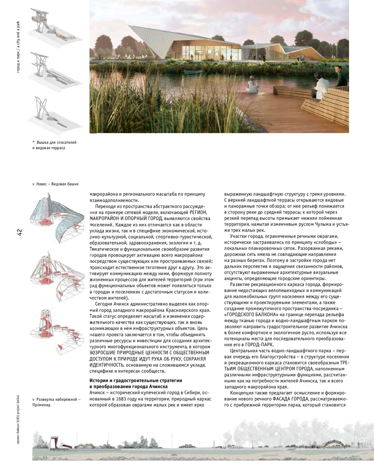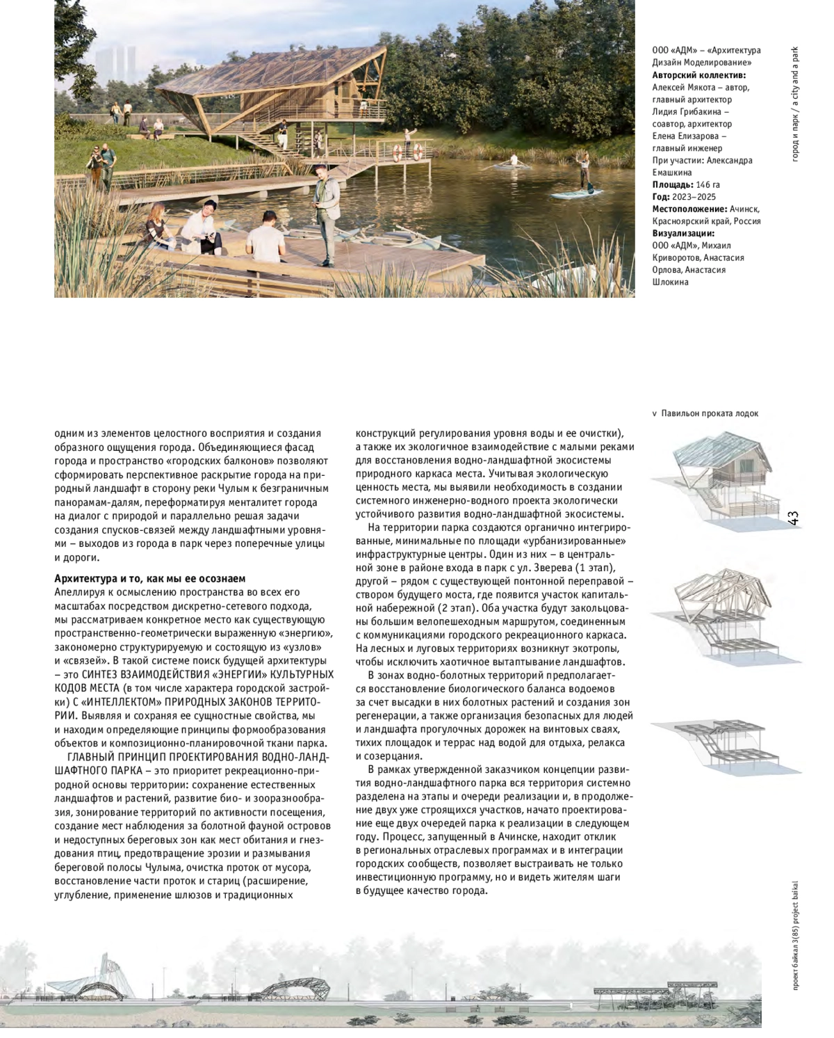 Реализация Водно-ландшафтного парка в г. Ачинске на реке Чулым началась уже в этом сезоне. В поиске решений авторы охватывают масштаб от использования методологических и интуитивных моделей до масштаба дизайна узлов и архитектурных деталей. В качестве базового ориентира формирования города как органичного устойчивого механизма авторы подчер кивают, что ЧЕЛОВЕК, ЕГО ДЕЯТЕЛЬНОСТЬ И СРЕДА ЕГО ОБИТАНИЯ КАК НЕОТЪЕМЛЕМАЯ ЧАСТЬ ПРИРОДНОГО ЕСТЕСТВА - главный принцип проектирования.