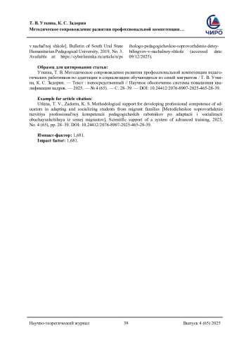 УТКИНА Т. В., ЗАДОРИН К. С. МЕТОДИЧЕСКОЕ СОПРОВОЖДЕНИЕ РАЗВИТИЯ ПРОФЕССИОНАЛЬНОЙ КОМПЕТЕНЦИИ ПЕДАГОГИЧЕСКИХ РАБОТНИКОВ ПО АДАПТАЦИИ И СОЦИАЛИЗАЦИИ ОБУЧАЮЩИХСЯ ИЗ СЕМЕЙ МИГРАНТОВ // НАУЧНОЕ ОБЕСПЕЧЕНИЕ СИСТЕМЫ ПОВЫШЕНИЯ КВАЛИФИКАЦИИ КАДРОВ. 2025. № 4 (65) (14 СТ.)