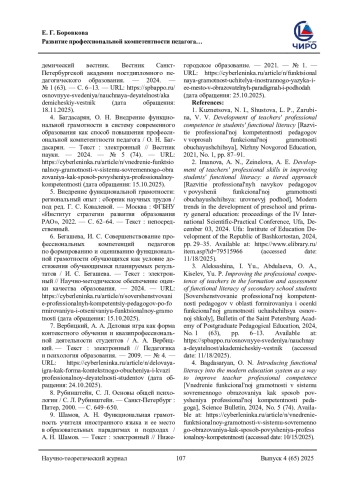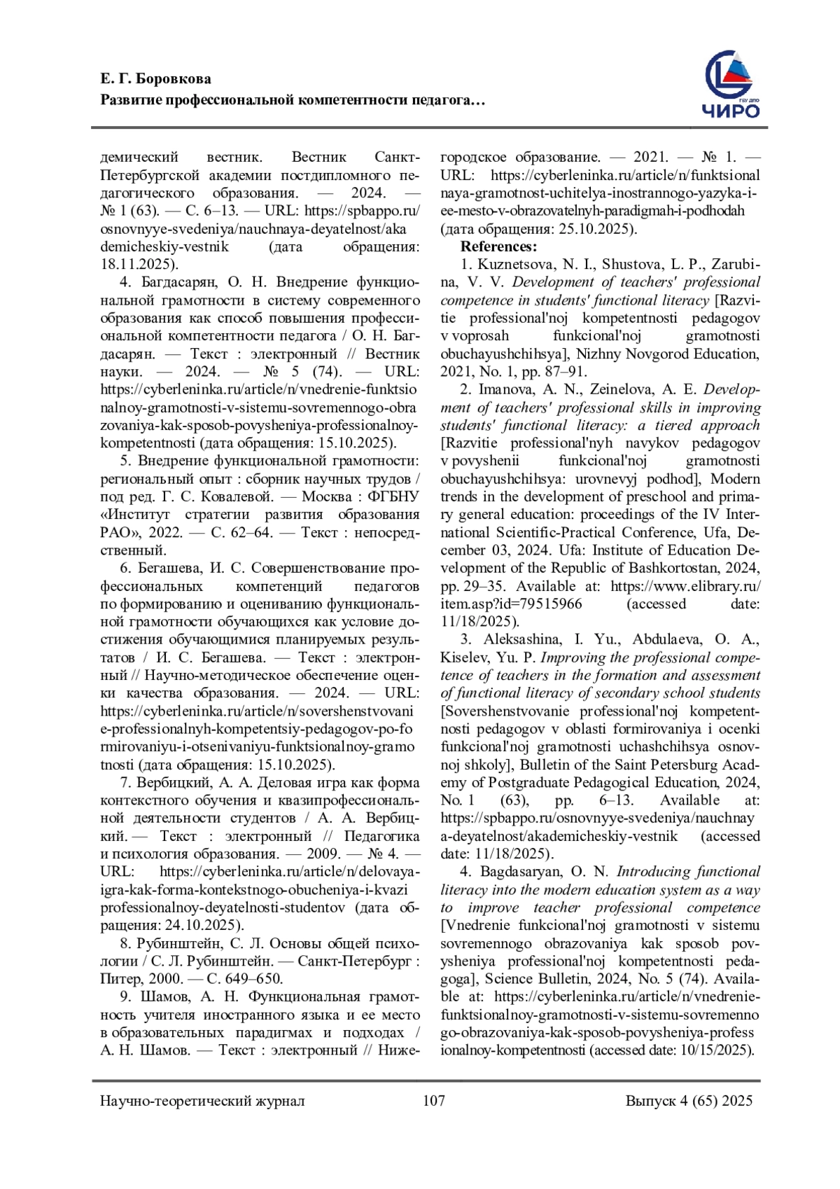 6. Бегашева, И. С. Совершенствование профессиональных компетенций педагогов по формированию и оцениванию функциональной грамотности обучающихся как условие достижения обучающимися планируемых результатов / И. С. Бегашева. - Текст : электронный // Научно-методическое обеспечение оценки качества образования. - 2024. - URL: https://cyberleninka.ru/article/n/sovershenstvovanie-professionalnyh-kompetentsiy-pedagogov-po-formirovaniyu-i-otsenivaniyu-funktsionalnoy-gramotnosti (дата обращения: 15.10.2025).