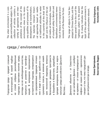 Городская среда – предмет сложный и многогранный. В нашей подборке статей собраны разнообразные подходы и трактовки понятия среды, взгляды на ее необходимые качества, процессы ее развития и трансформаций. В материалах пересекаются исторические подходы, опирающиеся на средневековые традиции отношения к воде в странах арабского «засушливого пояса», и влияние новейших технологий медиаарта, вопросы безопасности дворовых пространств в Бахрейне и Казахстане, средообразующие мемориалы Астаны и маргинальные среды российского Дальнего Востока…