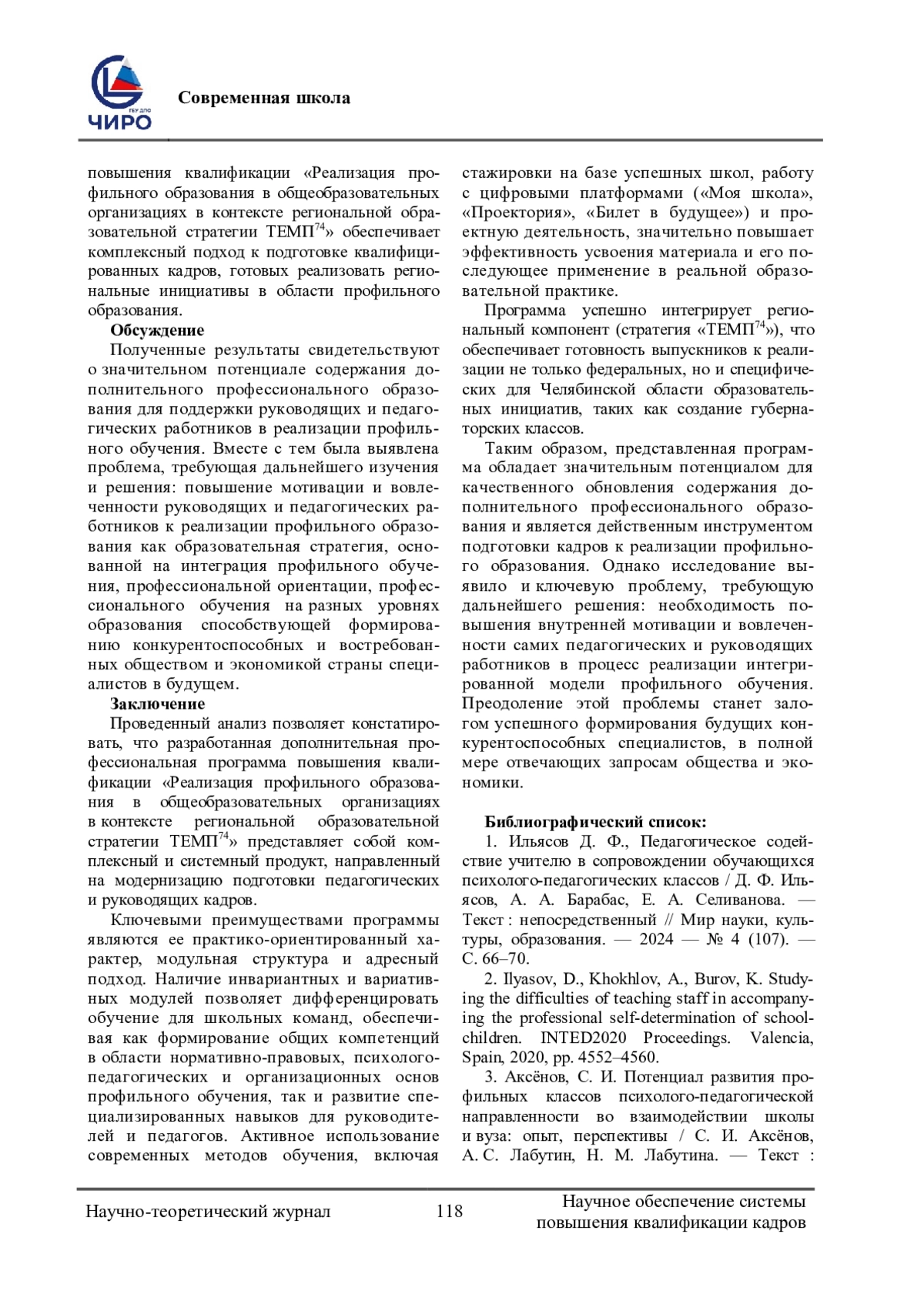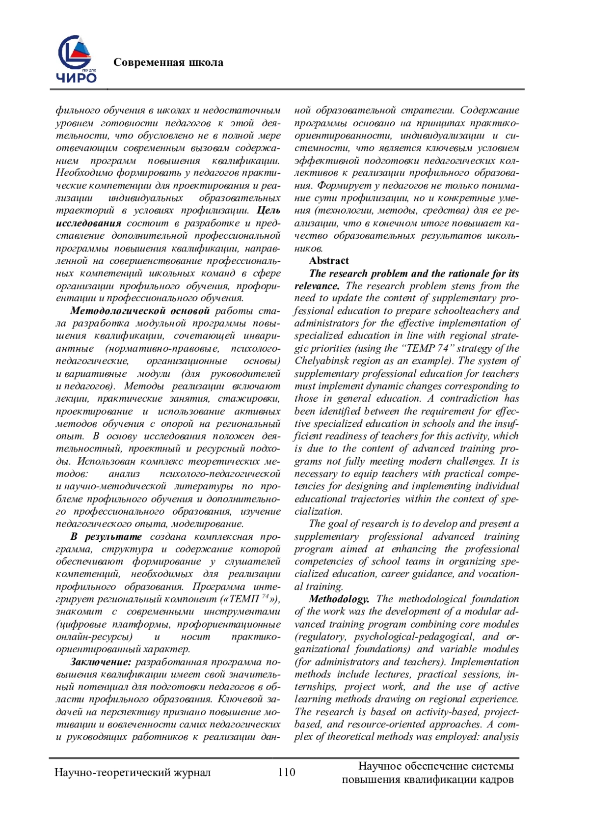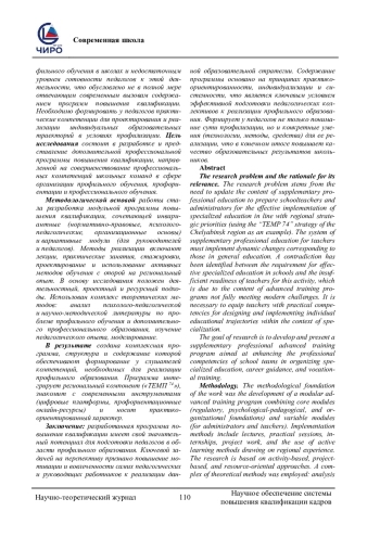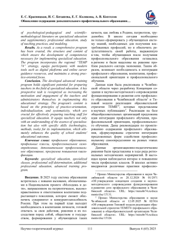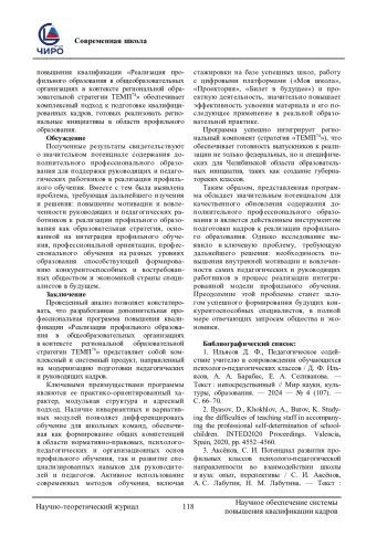 Проблема исследования и обоснование ее актуальности. Проблема исследования заключается в необходимости обновления содержания дополнительного профессионального образования для подготовки педагогических и руководящих работников школ к эффективной реализации профильного образования в соответствии с региональными стратегическими ориентирами (на примере стратегии «ТЕМП 74» в Челябинской области). Системе дополнительного профессионального образования педагогических работников необходимо реализовывать динамичные изменения в сфере общего образования. Выявлено противоречие между требованием к реализации эффективного профильного обучения в школах и недостаточным уровнем готовности педагогов к этой деятельности, что обусловлено не в полной мере отвечающим современным вызовам содержанием программ повышения квалификации. Необходимо формировать у педагогов практические компетенции для проектирования и реализации индивидуальных образовательных траекторий в условиях профилизации. Цель исследования состоит в разработке и представление дополнительной профессиональной программы повышения квалификации, направленной на совершенствование профессиональных компетенций школьных команд в сфере организации профильного обучения, профориентации и профессионального обучения. Методологической основой работы стала разработка модульной программы повышения квалификации, сочетающей инвариантные (нормативно-правовые, психолого-педагогические, организационные основы) и вариативные модули (для руководителей и педагогов). Методы реализации включают лекции, практические занятия, стажировки, проектирование и использование активных методов обучения с опорой на региональный опыт. В основу исследования положен деятельностный, проектный и ресурсный подходы. Использован комплекс теоретических методов: анализ психолого-педагогической и научно-методической литературы по проблеме профильного обучения и дополнительного профессионального образования, изучение педагогического опыта, моделирование. В результате создана комплексная программа, структура и содержание которой обеспечивают формирование у слушателей компетенций, необходимых для реализации профильного образования. Программа интегрирует региональный компонент («ТЕМП 74»), знакомит с современными инструментами (цифровые платформы, профориентационные онлайн-ресурсы) и носит практико-ориентированный характер. Заключение: разработанная программа повышения квалификации имеет свой значительный потенциал для подготовки педагогов в области профильного образования. Ключевой задачей на перспективу признано повышение мотивации и вовлеченности самих педагогических и руководящих работников к реализации данной образовательной стратегии. Содержание программы основано на принципах практико-ориентированности, индивидуализации и системности, что является ключевым условием эффективной подготовки педагогических коллективов к реализации профильного образования. Формирует у педагогов не только понимание сути профилизации, но и конкретные умения (технологии, методы, средства) для ее реализации, что в конечном итоге повышает качество образовательных результатов школьников.