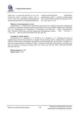 8. Зеер, Э. Ф. От индивидуально-психологических особенностей подростков к транспрофессионализму в социально-профессиональном будущем: сущностный анализ и результаты исследования / Э. Ф. Зеер, М. В. Зиннатова, Н. П. Моисеева. - Текст : непосредственный // Известия Российской академии образования. - 2023. - № 2 (62). - С. 141-154.