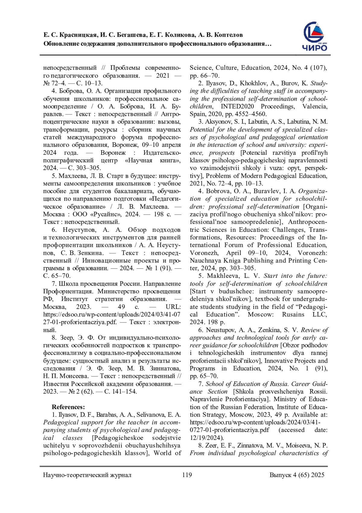 2. Ilyasov, D., Khokhlov, A., Burov, K. Studying the difficulties of teaching staff in accompanying the professional self-determination of schoolchildren.INTED2020 Proceedings. Valencia, Spain, 2020, pp. 4552-4560.