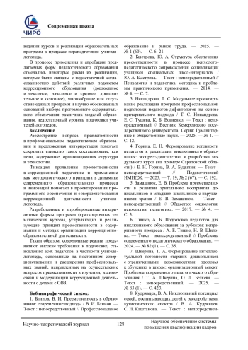 3. Никандрова, Т. С. Модульное проектирование реализации программ профессиональной подготовки педагогов-дефектологов на основе критериального подхода / Т. С. Никандрова, Е. С. Тушева, К. Б. Вовненко. - Текст : непосредственный // Вестник Кемеровского государственного университета. Серия: Гуманитарные и общественные науки. - 2025. - № 1. - C. 12.