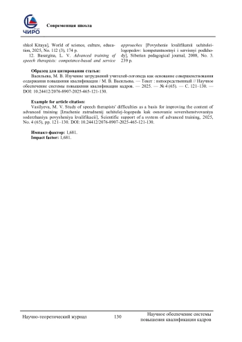12. Басаргина, Л. В. Повышение квалификации учителей-логопедов: компетентностный и сервисный подходы / Л. В. Басаргина. - Текст : непосредственный // Сибирский педагогический журнал. - 2008. - № 3. - 239 с.
