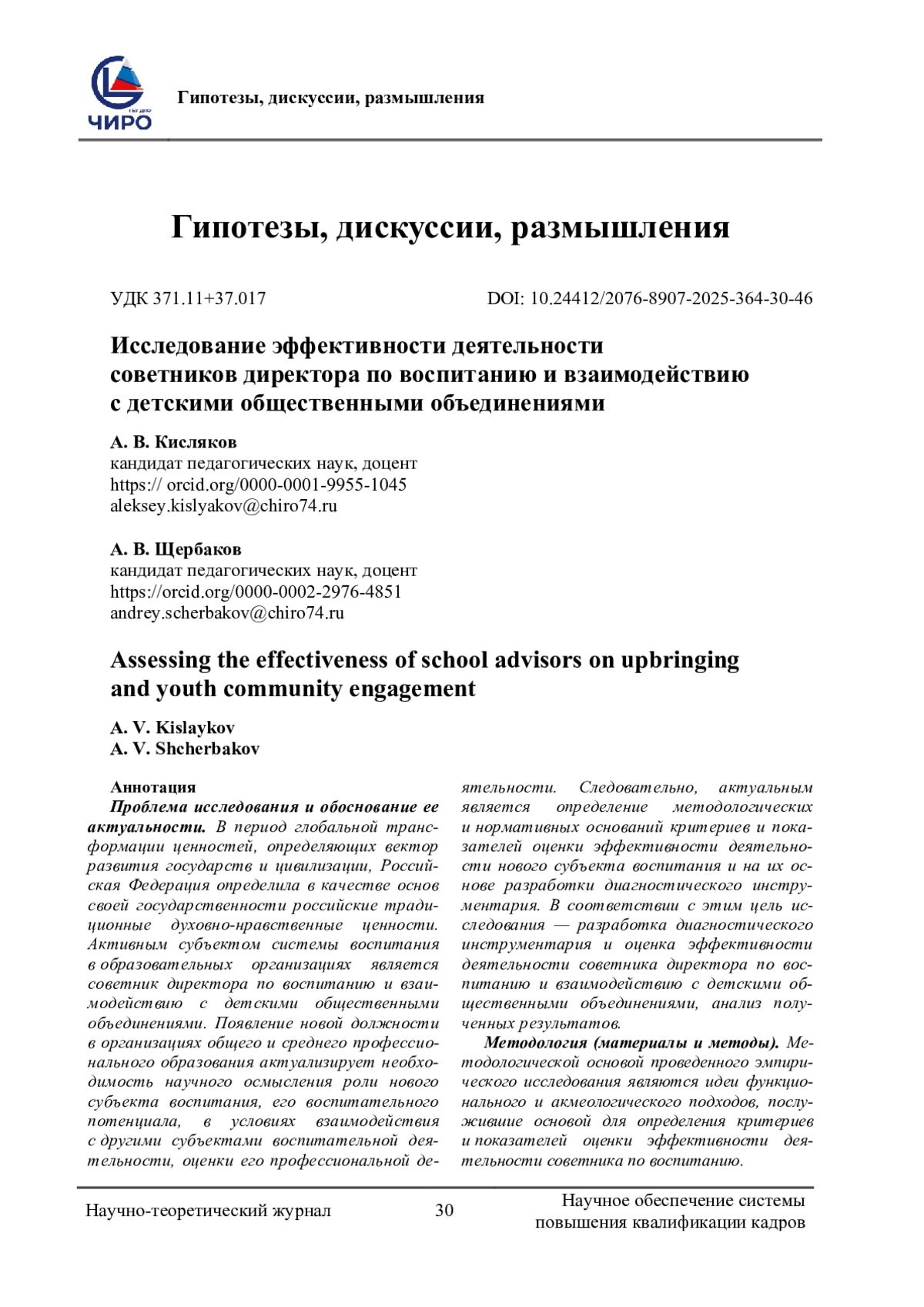 9. Лаврентьева, О. А. Деятельность советника директора по воспитанию и взаимодействию с детскими общественными организациями: оценка ожиданий и потенциала совершенствования воспитательной работы с обучающимися / О. А. Лаврентьева, Е. М. Скрыпникова, Б. А. Дейч, З. И. Лаврентьева. - Текст: непосредственный // Science for Education Today. - 2023. - Т. 1, № 6. - С. 7-36. EDN: MIOVXH