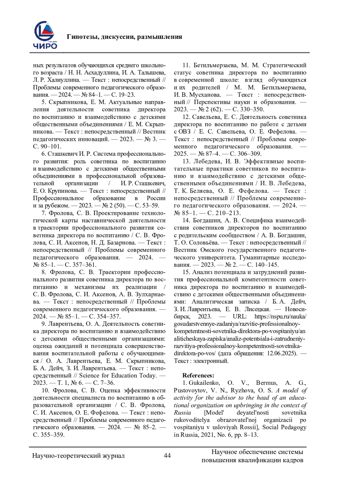 1. Гукалеко, О. В. Модель деятельности советника руководителя образовательной организации по воспитанию в условиях России / О. В. Гукалеко, А. Г. Бермус, В. Н. Пустовойтов, О. С. Рыжова. - Текст: непосредственный // Социальная педагогика в России: научно-методический журнал. - 2021. - № 6. - С. 8-13. EDN: XRARAO
