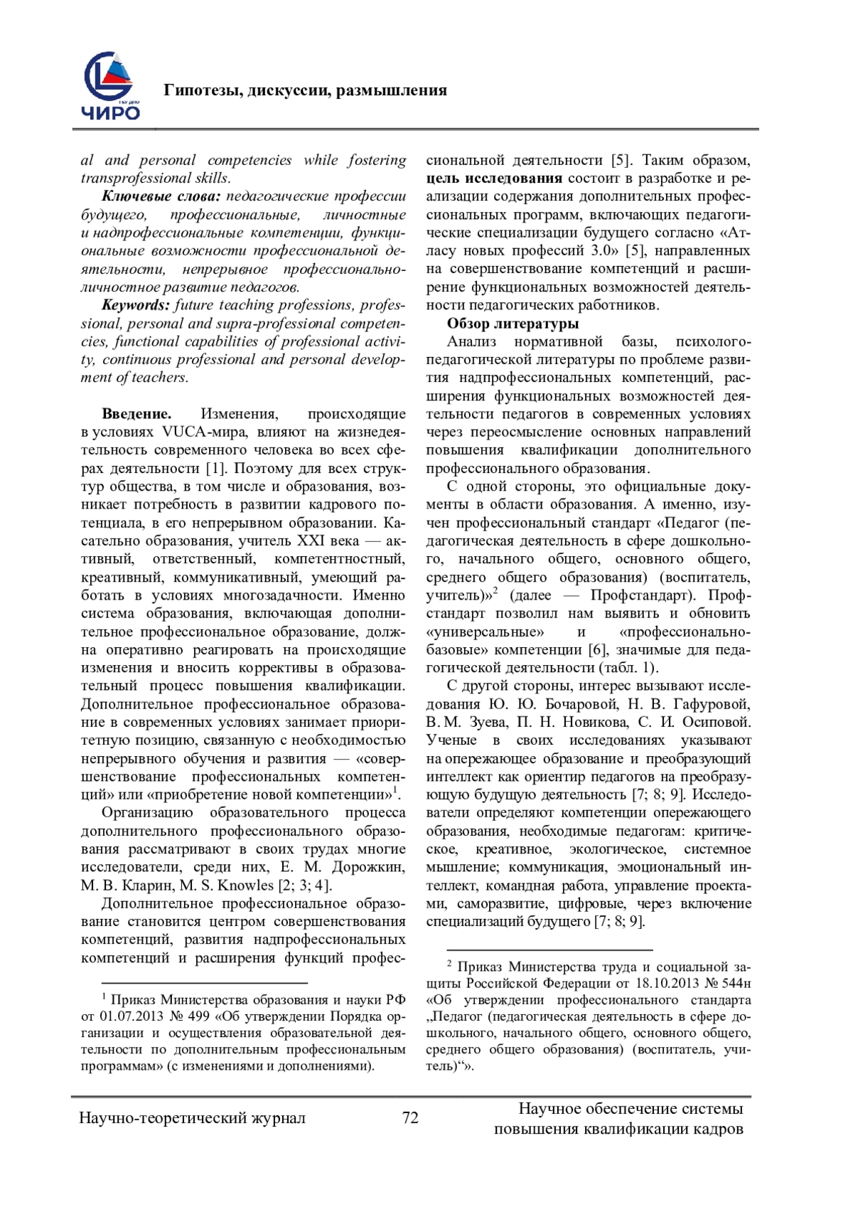 Проблема исследования и обоснование ее актуальности. Автор статьи определяет изменения, происходящие в современном мире, и соотносит с требованиями к педагогам, к их профессионально-личностному развитию. В статье рассматриваются педагогические специализации будущего в качестве важного элемента содержания непрерывного профессионально-личностного развития педагогов в образовательном процессе дополнительного профессионального образования как инновационный подход в повышении квалификации. Цель исследования состоит в разработке и реализации содержания дополнительных профессиональных программ, включающих педагогические специализации будущего согласно «Атласу новых профессий 3.0». Методология (методы и материалы). В процессе исследования осуществлялись анализ нормативно-правовых актов, научных трудов, посвященных рассматриваемой тематикой, анкетирование по выявлению образовательных потребностей, сбор и обработка данных по теме исследования. В исследовании применялись компетентностный, деятельностный, личностно ориентированный подходы. Результаты исследования. В исследовании приведены результаты как на теоретическом, так и на практическом уровне. Расширение функциональных возможностей деятельности по специальностям будущего, указанным в «Атласе новых профессий 3.0» как необходимое условие на сегодняшний день в рамках реализации дополнительных профессиональных программ, позволяет совершенствовать профессиональные и личностные, а также развивать надпрофессиональные компетенции.