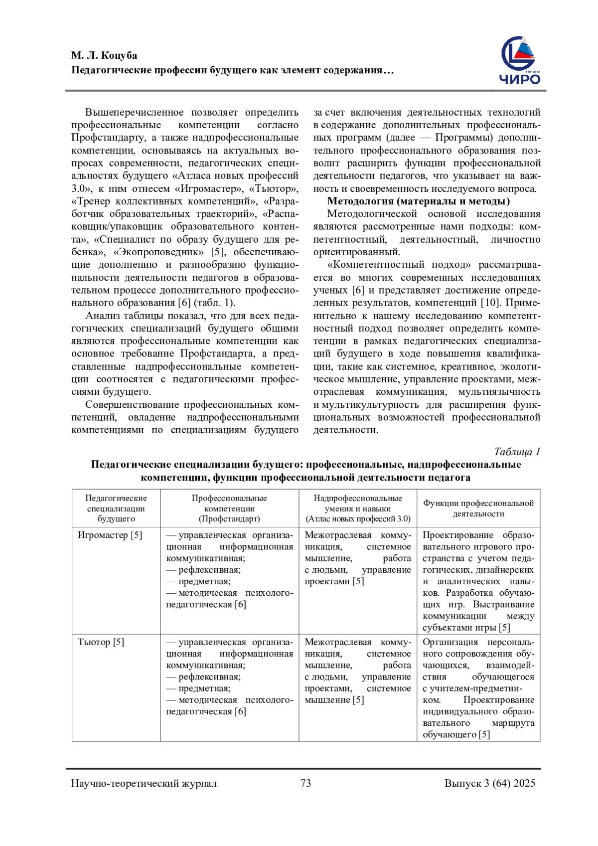 6. Коцуба, М. Л. Диагностический инструментарий выявления профессионально-личностного развития педагогов в дополнительном профессиональном образовании / М. Л. Коцуба, С. И. Осипова. - Текст: непосредственный // Педагогический журнал. - 2024. - Т. 14, № 4-1. - С. 362-371. EDN: OKURUG