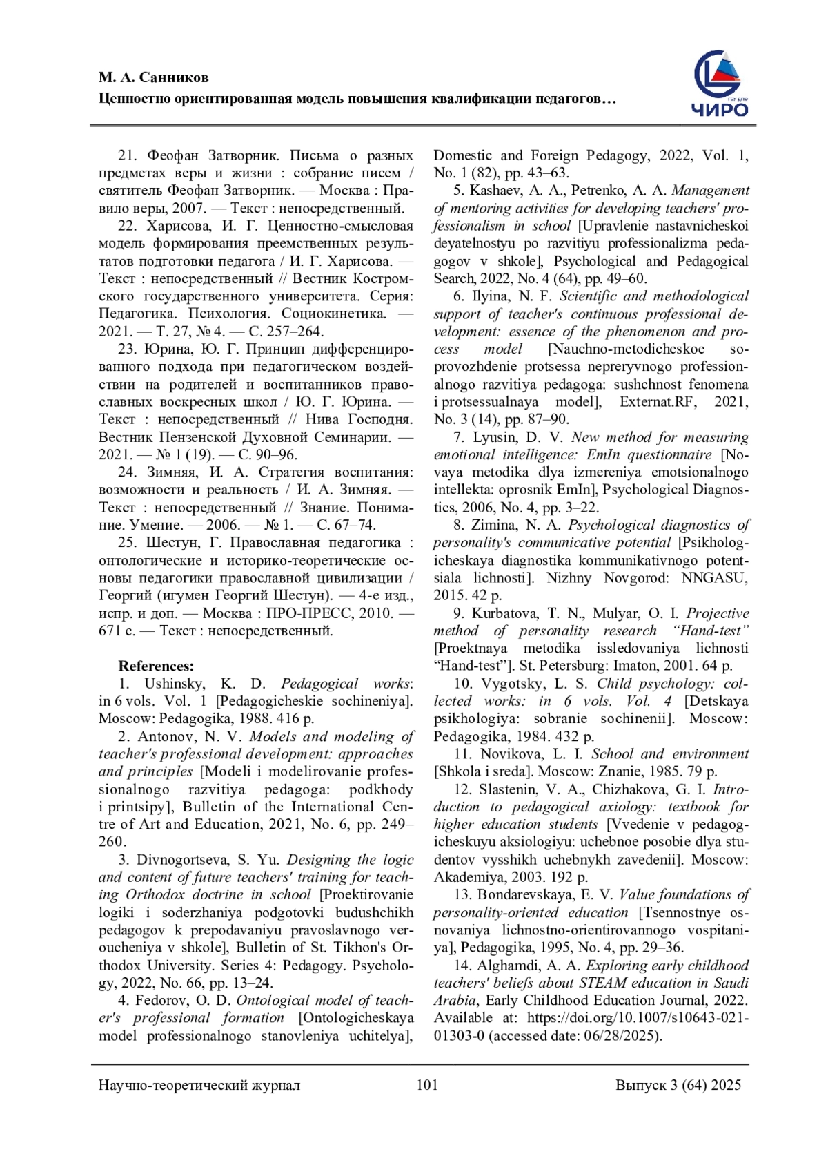 3. Дивногорцева, С. Ю. Проектирование логики и содержания подготовки будущих педагогов к преподаванию православного вероучения в школе / С. Ю. Дивногорцева. - Текст: непосредственный // Вестник Православного Свято-Тихоновского гуманитарного университета. Серия 4: Педагогика. Психология. - 2022. - № 66. - С. 13-24. EDN: KRKFPU