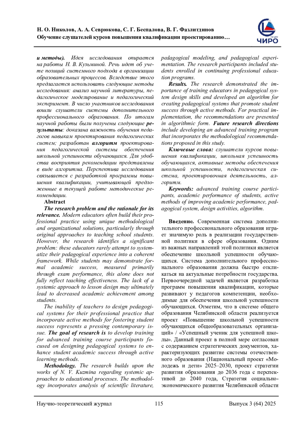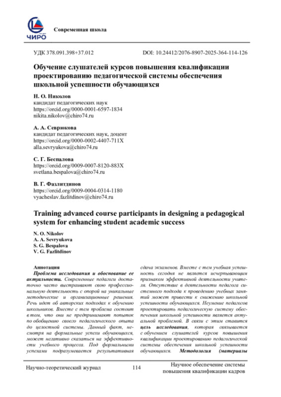 Проблема исследования и обоснование ее актуальности. Современные педагоги достаточно часто выстраивают свою профессиональную деятельность с опорой на уникальные методические и организационные решения. Речь идет об авторских подходах к обучению школьников. Вместе с тем проблема состоит в том, что они не предпринимают попыток по обобщению своего педагогического опыта до целостной системы. Данный факт, несмотря на формальные успехи обучающихся, может негативно сказаться на эффективности учебного процесса. Под формальными успехами подразумевается результативная сдача экзаменов. Вместе с тем учебная успешность сегодня не является исчерпывающим признаком эффективной деятельности учителя. Отсутствие в деятельности педагога системного подхода к проведению учебных занятий может привести к снижению школьной успешности обучающихся. Неумение педагогов проектировать педагогическую систему обеспечения школьной успешности является актуальной проблемой. В связи с этим ставится цель исследования, которая связывается с обучением слушателей курсов повышения квалификации проектированию педагогической системы обеспечения школьной успешности обучающихся. Методология (материалы и методы). Идея исследования опирается на работы Н. В. Кузьминой. Речь идет об учете позиций системного подхода в организации образовательных процессов. Вследствие этого предлагается использовать следующие методы исследования: анализ научной литературы, педагогическое моделирование и педагогический эксперимент. В число участников исследования вошли слушатели системы дополнительного профессионального образования. По итогам научной работы были получены следующие результаты: доказана важность обучения педагогов навыкам проектирования педагогических систем; разработан алгоритм проектирования педагогической системы обеспечения школьной успешности обучающихся. Для удобства восприятия рекомендации представлены в виде алгоритма. Перспектива исследования связывается с разработкой программы повышения квалификации, учитывающей предложенные в текущей работе методические рекомендации.