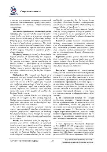 Проблема исследования и обоснование ее актуальности. Актуальность исследования определяется необходимостью формирования суверенной системы образования, ориентированной на единство образовательного и воспитательного пространства, что предполагает и повышение требований к уровню профессионализма педагогов. Тенденция на аксиологизацию и гуманизацию образования имеется в региональной системе образования Кировской области, в том числе и в дополнительном профессиональном образовании. Цель исследования - проанализировав методические особенности реализации курса регионоведения в Кировской области, разработать задания для текущего контроля, промежуточной аттестации учителей истории - слушателей курсов повышения квалификации «Особенности преподавания курса «Регионоведение» в общеобразовательных организациях», а также критерии оценки итоговой аттестационной работы. Методология (материалы и методы). Исследование осуществлялось на основе системного подхода к анализу методической особенности преподавания курса регионоведения в школах Кировской области. Исследование проводилось с применением методов анализа и синтеза информации нормативно-правового и научного характера, эмпирических и статистических данных, полученных в результате изучения особенностей преподавания курса «Регионоведение». Анализ показал, что подавляющее большинство школ нашей области используют имеющуюся программу курса регионоведения. Вместе с тем была выявлена проблема недостаточного учебно-методического обеспечения данного курса. Для решения проблемы были проведены курсы повышения квалификации, цель которых - совершенствование профессиональных компетенций слушателей в области преподавания курса «Регионоведение» через разработку учебно-методических комплектов по курсу. Результаты. Нами были разработаны задания для текущего контроля, промежуточной аттестации слушателей курсов повышения квалификации, а также критерии оценки итоговой аттестационной работы. Педагоги представили комплекты учебно-методических материалов по регионоведению (сценарий занятия, методические рекомендации к занятию, мультимедийная презентация к занятию, рабочий лист занятия). Считаем, что данные УМК могут быть использованы учителями и при изучении учебного курса «История нашего края». Далее мы определим ценностно-смысловые основы изучения региональной истории в целом, а также перспективы развития региональной системы дополнительного профессионального образования по данному стратегическому направлению.