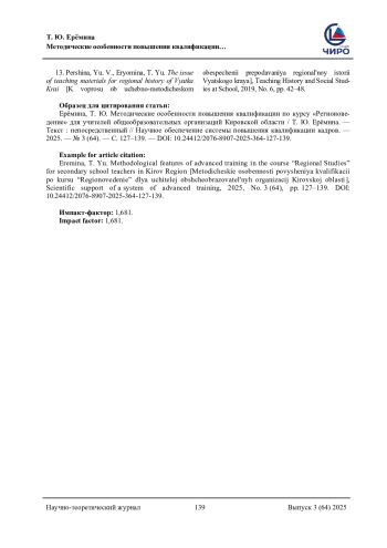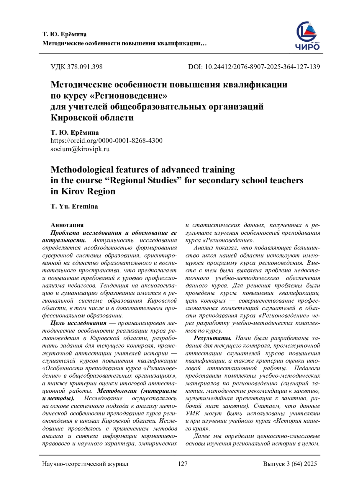 ЕРЕМИНА Т. Ю. МЕТОДИЧЕСКИЕ ОСОБЕННОСТИ ПОВЫШЕНИЯ КВАЛИФИКАЦИИ ПО КУРСУ «РЕГИОНОВЕДЕНИЕ» ДЛЯ УЧИТЕЛЕЙ ОБЩЕОБРАЗОВАТЕЛЬНЫХ ОРГАНИЗАЦИЙ КИРОВСКОЙ ОБЛАСТИ // НАУЧНОЕ ОБЕСПЕЧЕНИЕ СИСТЕМЫ ПОВЫШЕНИЯ КВАЛИФИКАЦИИ КАДРОВ. 2025. № 3 (64) (13 СТ.)