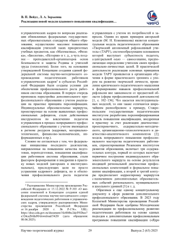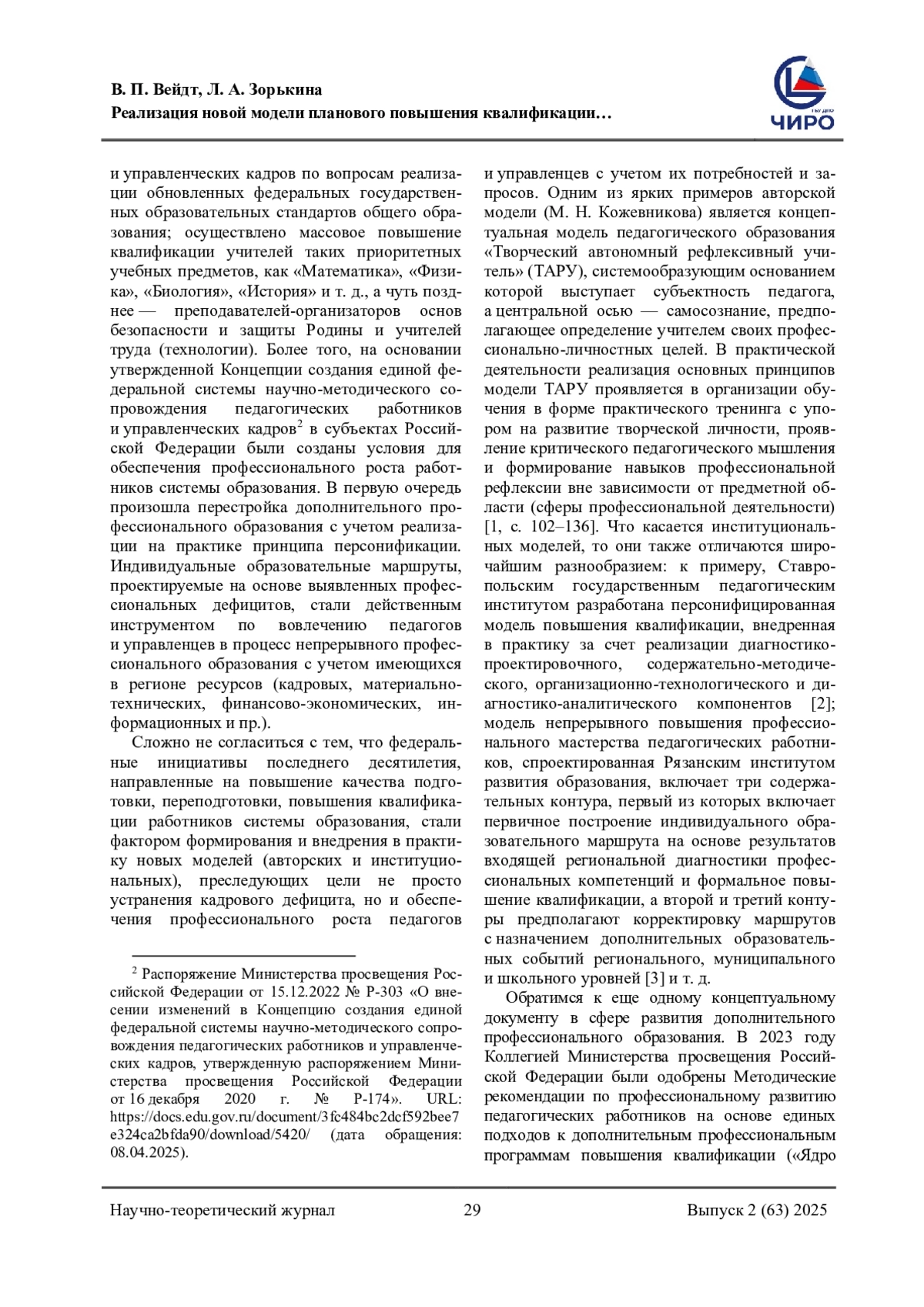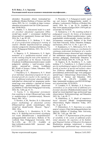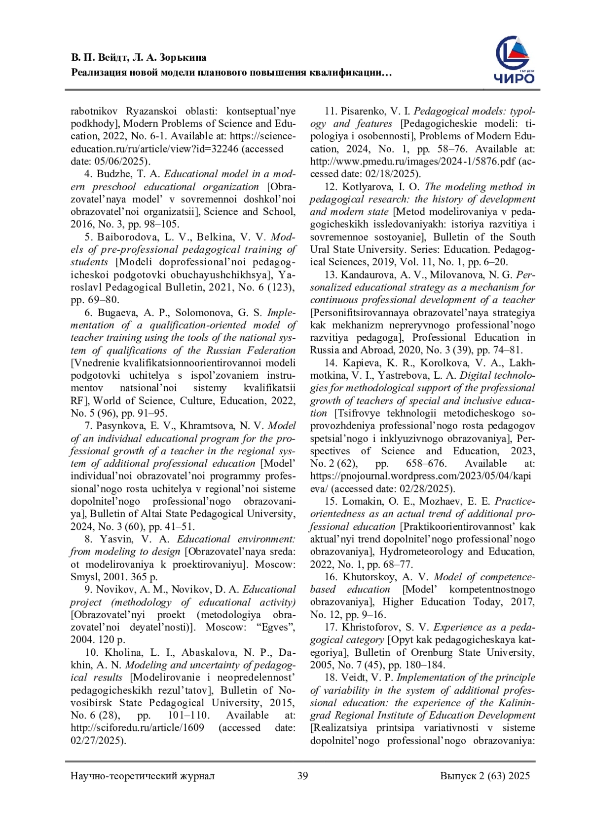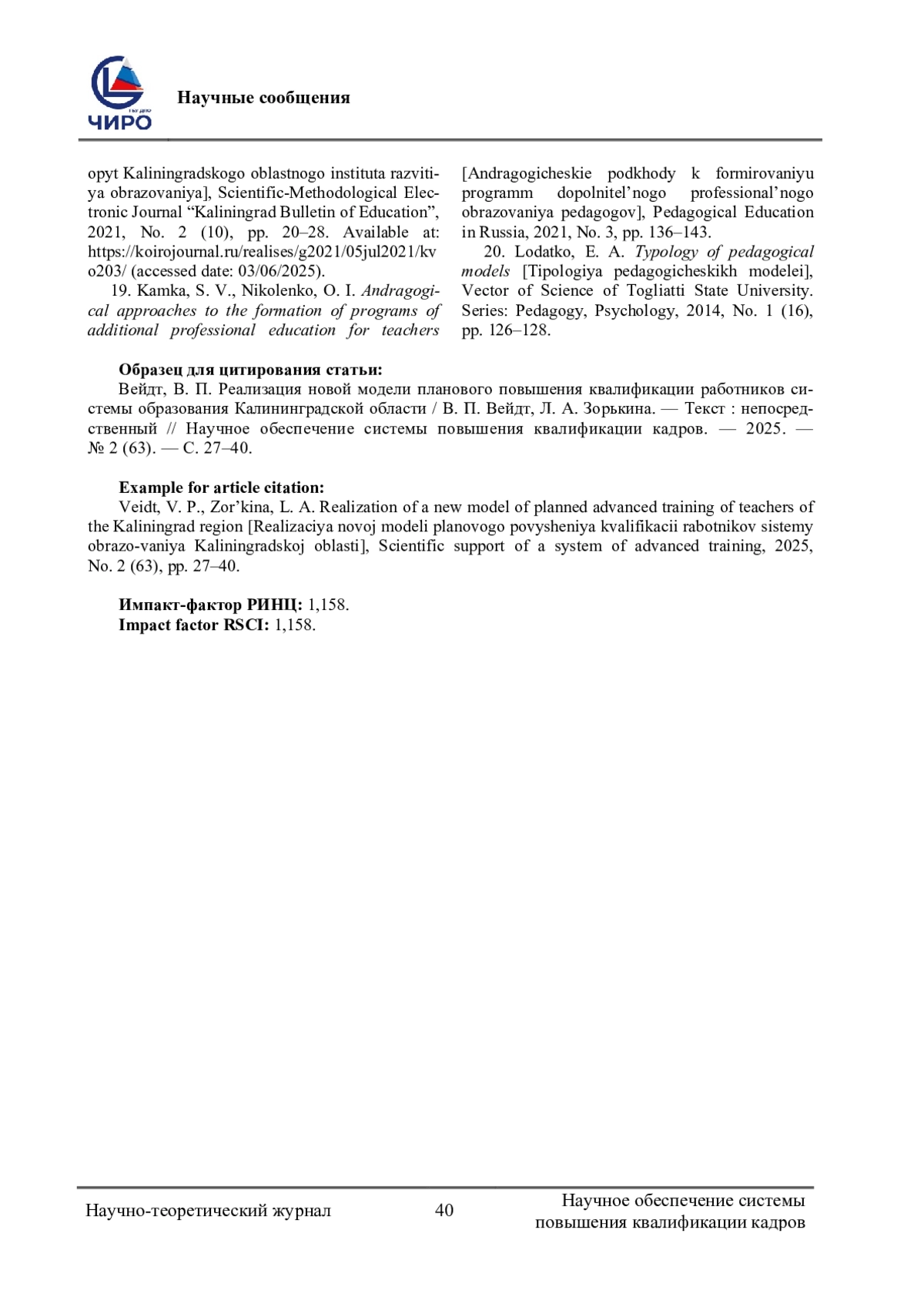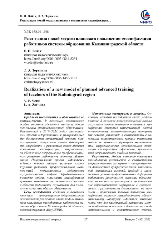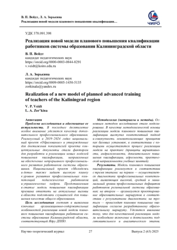 ВЕЙДТ В. П., ЗОРЬКИНА Л.А. РЕАЛИЗАЦИЯ НОВОЙ МОДЕЛИ ПЛАНОВОГО ПОВЫШЕНИЯ КВАЛИФИКАЦИИ РАБОТНИКОВ СИСТЕМЫ ОБРАЗОВАНИЯ КАЛИНИНГРАДСКОЙ ОБЛАСТИ // НАУЧНОЕ ОБЕСПЕЧЕНИЕ СИСТЕМЫ ПОВЫШЕНИЯ КВАЛИФИКАЦИИ КАДРОВ. 2025. № 2 (63) (14 СТ.)
