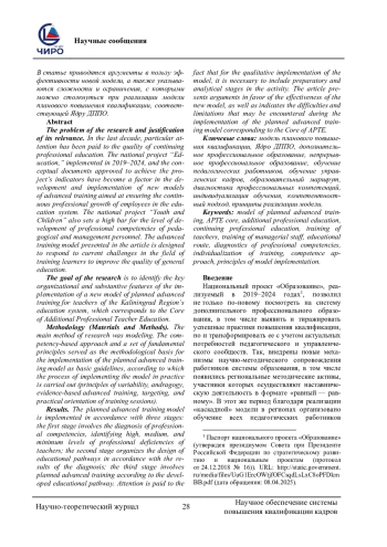 Проблема исследования и обоснование ее актуальности. В последнее десятилетие особое внимание уделяется качеству дополнительного профессионального образования. Реализуемый в 2019-2024 годах национальный проект «Образование» и утвержденные для достижения показателей проекта концептуальные документы стали фактором для разработки и реализации новых моделей повышения квалификации, направленных на обеспечение непрерывного профессионального развития работников системы образования. Национальный проект «Молодежь и дети» также задает высокую планку к уровню развития профессиональных компетенций педагогических работников и управленческих кадров. Представленная в статье модель повышения квалификации призвана ответить на актуальные вызовы в области подготовки слушателей для повышения качества общего образования. Цель исследования состоит в выявлении ключевых организационно-содержательных особенностей реализации новой модели планового повышения квалификации работников системы образования Калининградской области, соответствующей Ядру ДППО. Методология (материалы и методы). Основным методом исследования стало моделирование. В качестве методологической основы реализации модели планового повышения квалификации выступил компетентный подход и совокупность основополагающих принципов как базовых установок, в соответствии с которыми осуществляется процесс реализации модели на практике (принципы вариативности, андрагогичности, доказательного повышения квалификации, адресности, практической направленности учебных занятий). Результаты. Модель планового повышения квалификации реализуется в соответствии с тремя этапами: на первом - осуществляется диагностика профессиональных компетенций, выявляющая высокий, средний и минимальный уровни профессиональных дефицитов работников региональной системы образования; на втором - организуется проектирование образовательных маршрутов в соответствии с результатами диагностики; на третьем - происходит плановое повышение квалификации согласно разработанному образовательныму маршруту. Уделяется внимание тому, что для качественной реализации модели необходимо включение в деятельность подготовительного и аналитического этапов. В статье приводятся аргументы в пользу эффективности новой модели, а также указываются сложности и ограничения, с которыми можно столкнуться при реализации модели планового повышения квалификации, соответствующей Ядру ДППО.