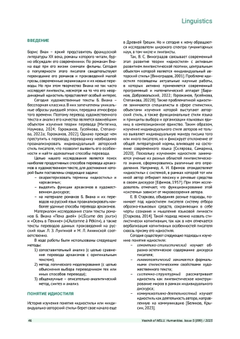 Борис Виан – яркий представитель французской литературы XX века, романы которого читали, бурно обсуждали его современники. По романам Виана еще при его жизни снима ли фильмы. Сегодня о популярности этого писателя свидетельствуют переиздание его романов и произведений малой прозы, современные экранизации и их новые переводы. Но при этом творчество Виана не так часто исследуют лингвисты, несмотря на то что его неординарный идиостиль представляет особый интерес.