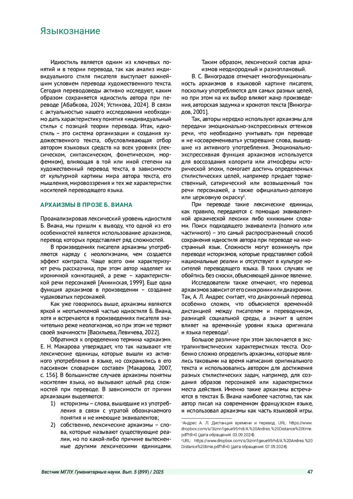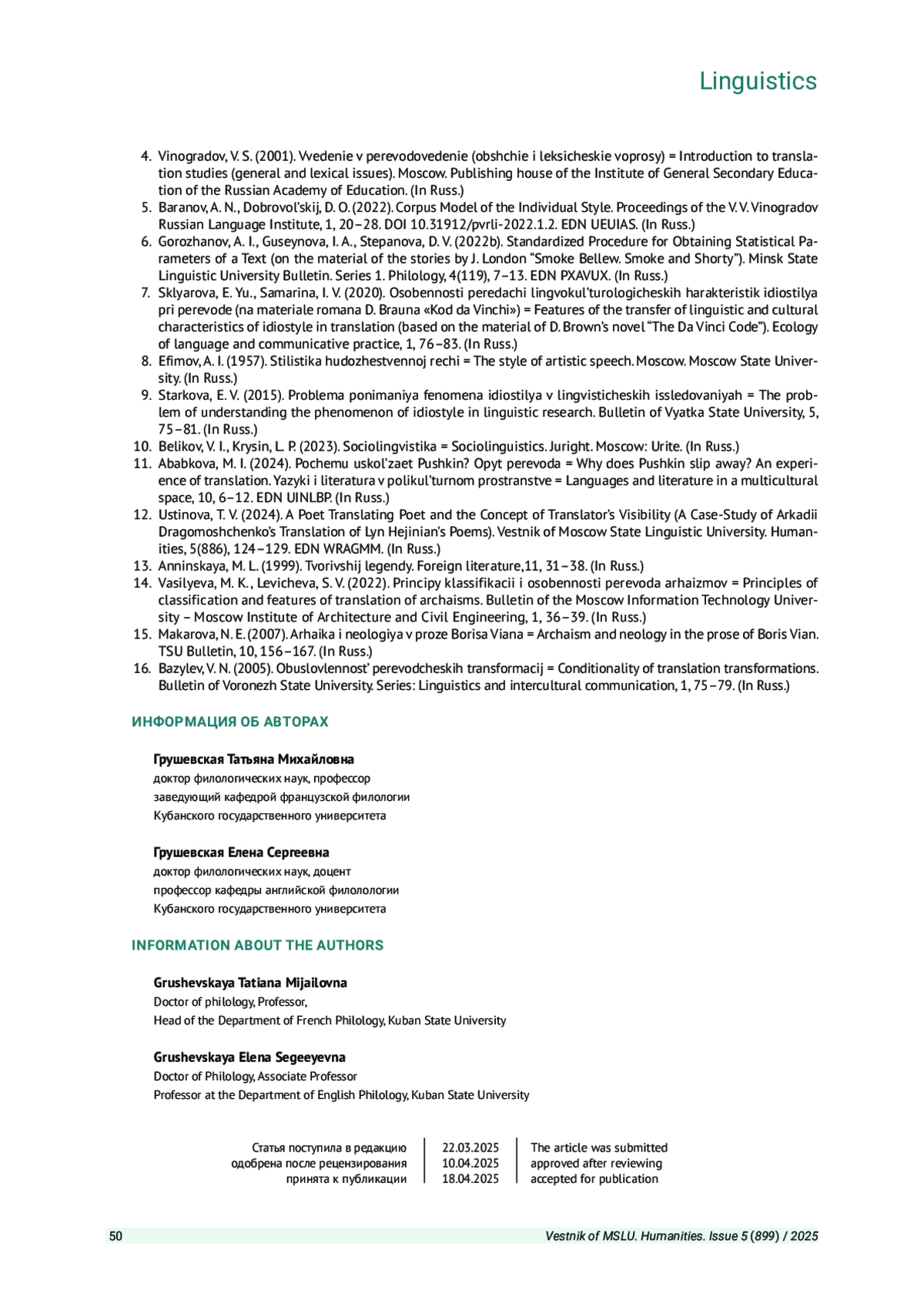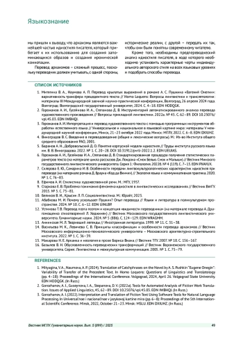 14. Васильева М. К., Левичева С. В. Принципы классификации и особенности перевода архаизмов // Вестник Московского информационно-технологического университета - Московского архитектурно-строительного института. 2022. № 1. С. 36-39. EDN: XNDFLU