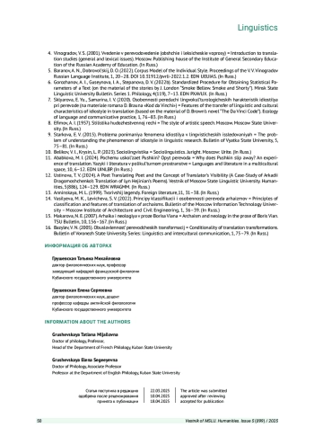 16. Базылев В. Н. Обусловленность переводческих трансформаций // Вестник Воронежского государственного университета. Серия: Лингвистика и межкультурная коммуникация. 2005. № 1. С. 75-79.