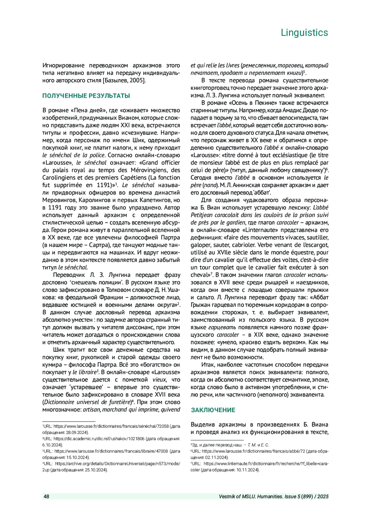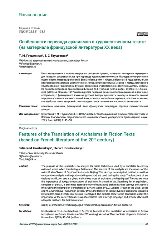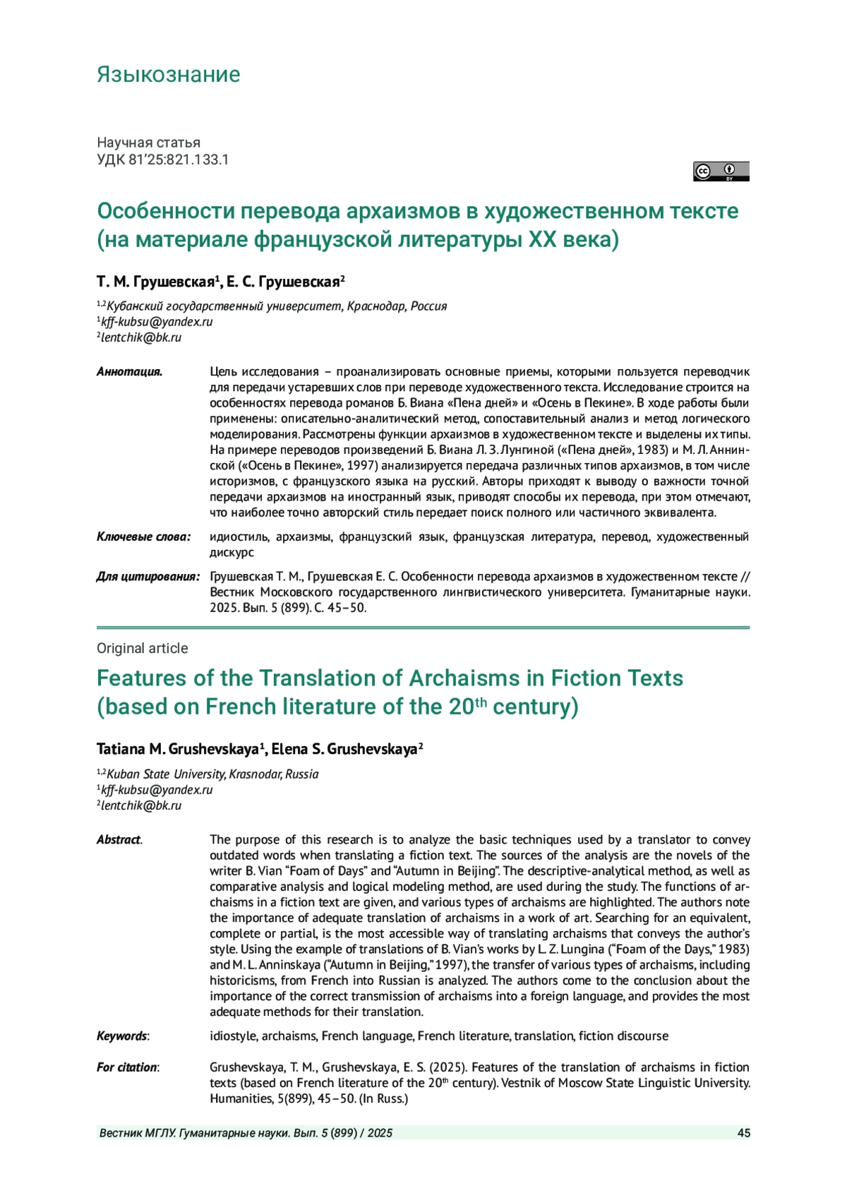 Цель исследования - проанализировать основные приемы, которыми пользуется переводчик для передачи устаревших слов при переводе художественного текста. Исследование строится на особенностях перевода романов Б. Виана «Пена дней» и «Осень в Пекине». В ходе работы были применены: описательно-аналитический метод, сопоставительный анализ и метод логического моделирования. Рассмотрены функции архаизмов в художественном тексте и выделены их типы. На примере переводов произведений Б. Виана Л. З. Лунгиной («Пена дней», 1983) и М. Л. Аннинской («Осень в Пекине», 1997) анализируется передача различных типов архаизмов, в том числе историзмов, с французского языка на русский. Авторы приходят к выводу о важности точной передачи архаизмов на иностранный язык, приводят способы их перевода, при этом отмечают, что наиболее точно авторский стиль передает поиск полного или частичного эквивалента.