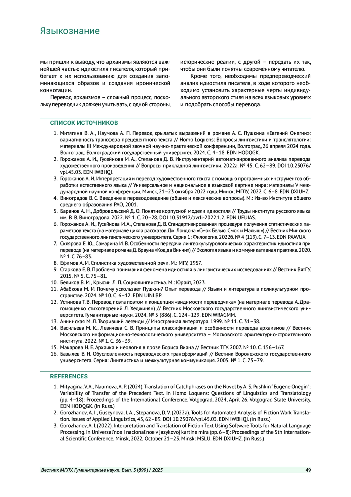 2. Горожанов А. И., Гусейнова И. А., Степанова Д. В. Инструментарий автоматизированного анализа перевода художественного произведения // Вопросы прикладной лингвистики. 2022а. № 45. С. 62-89. DOI: 10.25076/vpl.45.03 EDN: IWBHQI