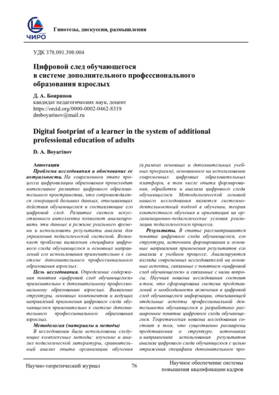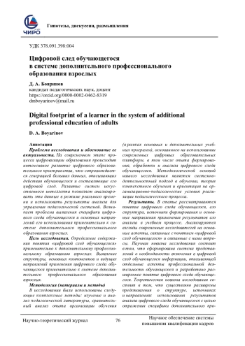 Проблема исследования и обоснование ее актуальности. На современном этапе процесса цифровизации образования происходит интенсивное развитие цифрового образовательного пространства, что сопровождается генерацией больших данных, описывающих действия обучающегося и составляющие его цифровой след. Развитие систем искусственного интеллекта позволяет анализировать эти данные в режиме реального времени и использовать результаты анализа для управления педагогической системой. Возникает проблема выявления специфики цифрового следа обучающегося и основных направлений его использования применительно к системе дополнительного профессионального образования взрослых. Цель исследования. Определение содержания понятия «цифровой след обучающегося» применительно к дополнительному профессиональному образованию взрослых. Выявление структуры, основных компонентов и ведущих направлений применения цифрового следа обучающегося применительно к системе дополнительного профессионального образования взрослых. Методология (материалы и методы) В исследовании были использованы следующие комплексные методы: изучение и анализ педагогической литературы, сравнительный анализ опыта организации обучения (в рамках основных и дополнительных учебных программ), основанного на использовании современных цифровых образовательных платформ, в том числе опыта формирования, обработки и анализа цифрового следа обучающегося. Методологической основой нашего исследования является системно-деятельностный подход в обучении, теория контекстного обучения и ориентация на организационно-педагогические условия реализации педагогического процесса. Результаты. В статье рассматриваются понятие цифрового следа обучающегося, его структура, источники формирования и основные направления применения результатов его анализа в учебном процессе. Анализируются взгляды современных исследователей на основные аспекты, связанные с понятием «цифровой след обучающегося» и связанные с ними вопросы. Научная новизна исследования состоит в том, что сформирована система представлений о необходимости включения в цифровой след обучающегося информации, описывающей отдельные аспекты профессиональной деятельности обучающегося и разработано расширенное понятие цифрового следа обучающегося. Теоретическая новизна исследования состоит в том, что существенно расширены представления о структуре, источниках и направлениях использования результатов анализа цифрового следа обучающегося с целью отражения специфики дополнительного профессионального образования взрослых. Традиционная семикомпонентная структура цифрового следа обучающегося дополнена нами тремя новыми компонентами. Расширен перечень источников больших данных, составляющих основу цифрового следа обучающегося. Существенно дополнен перечень основных направлений применения методов анализа образовательных данных. Практическая новизна исследования состоит в том, что разработанная система представлений о сущности, структуре, источниках формирования и направлениях использования цифрового следа обучающегося в дополнительном профессиональном образовании взрослых может служить основой для проектирования содержания и форм и сценариев реализации дополнительных профессиональных п