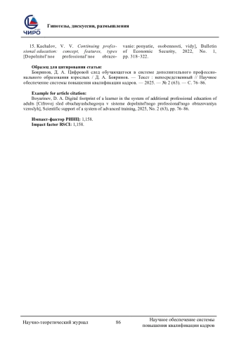 15. Качалов, В. В. Дополнительное профессиональное образование: понятие, особенности, виды / В. В. Качалов. - Текст: непосредственный // Вестник экономической безопасности. - 2022. - № 1. - С. 318-322.