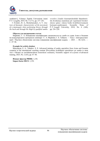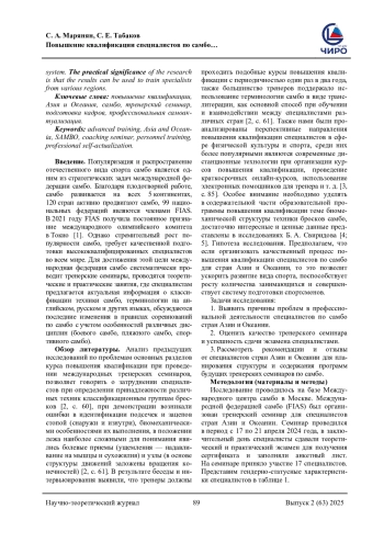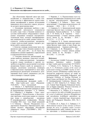 3. Марянян, С. А. Перспективные пути повышения квалификации специалистов по самбо в системе дополнительного образования / С. А. Марянян, С. Е. Табаков. - Текст: непосредственный // Спортивно-педагогическое образование. - 2024. - № 1. - С. 82-89. EDN: WNKFUA