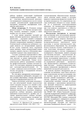 Проблема исследования и обоснование ее актуальности. В статье актуализируется проблема повышения качества медицинского просвещения взрослых. Населению должна быть доступна экспертная информация о вреде тех или иных факторов и о правильном использовании медицинских и гигиенических знаний. Решение поставленной проблемы обусловливает включение в систему непрерывного профессионального образования медицинских работников повышения их квалификации в области лекторской и просветительской деятельности. Цель исследования - теоретическое обоснование профиля профессиональных компетенций лектора - участника просветительской деятельности медицинского университета и на его основе создание условий для совершенствования лекторской практики в медицинском просвещении населения. Методология (материалы и методы). Для достижения цели исследования применялись системный и деятельностный подходы, позволившие изучить теоретические и практические вопросы подготовки медицинских работников, ориентированных на просветительскую деятельность среди населения, в системе дополнительного профессионального образования. В качестве научного инструмента для достижения поставленных задач были использованы теоретические методы исследования. Результаты. В ходе исследования делается заключение о необходимости развития теоретической базы для практического решения проблемы обеспечения качества просветительской деятельности в рамках социальной функции медицинского университета. По результатам анализа релевантных публикаций делается вывод, что лекторская практика востребована не только в системе профессионального образования, но и в системе дополнительного образования взрослых. На примере работы Открытого лектория Южно-Уральского государственного медицинского университета (ЮУГМУ) анализируется необходимость целенаправленного формирования лекторского корпуса из медицинских работников. Представлены характеристики четырех групп требований, определяющих профиль профессиональных компетенций лектора Открытого лектория ЮУГМУ. Данные требования определили разработку дополнительной профессиональной программы повышения квалификации, целью которой является совершенствование у слушателей компетенций, необходимых для реализации самостоятельной просветительской деятельности среди населения по вопросам здорового долголетия. Статья предназначена для работников системы дополнительного профессионального образования в здравоохранении, научных специалистов, руководителей медицинских организаций.