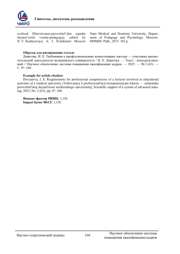 4. Муравьева, А. А. Компетенции преподавателей вузов: современные вызовы и смена парадигмы / А. А. Муравьева, О. Н. Олейникова. - Текст: непосредственный // Педагогика и психология образования. - 2020. - № 3. - С. 100-115. EDN: VIUNQH