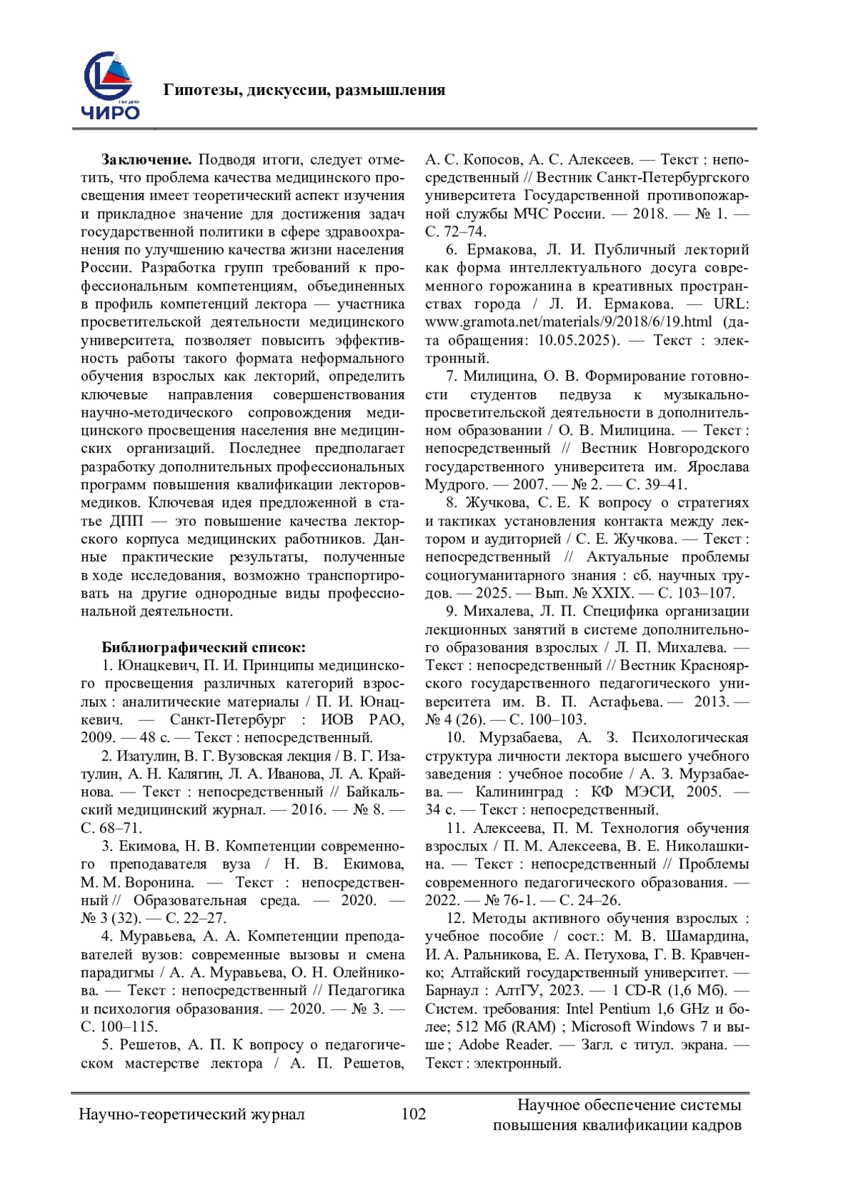 6. Ермакова, Л. И. Публичный лекторий как форма интеллектуального досуга современного горожанина в креативных пространствах города / Л. И. Ермакова. - URL: www.gramota.net/materials/9/2018/6/19.html (дата обращения: 10.05.2025). - Текст: электронный.