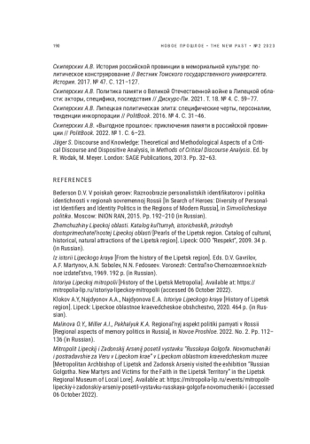 11. Скиперских А.В. История российской провинции в мемориальной культуре: политическое конструирование // Вестник Томского государственного университета. История. 2017. № 47. С. 121-127. EDN: ZAOZCD