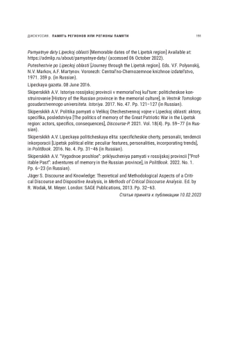 14. Скиперских А.В. “Выгодное прошлое”: приключения памяти в российской провинции // PolitBook. 2022. № 1. С. 6-23. EDN: EHNFGD