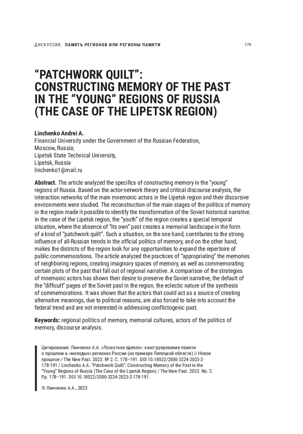 На примере Липецкой области в статье анализируется специфика конструирования памяти о прошлом в «молодых» регионах России. На основе акторно-сетевого подхода и критического дискурс-анализа были изучены сети взаимодействия основных акторов политики памяти в Липецкой области в контексте создаваемых ими дискурсивных сред. Реконструкция основных этапов политики памяти в регионе позволила выявить особенности преобразования советского исторического нарратива. «Молодость» региона создает особую темпоральную ситуацию, где отсутствие «своего» прошлого создает мемориальный ландшафт в виде своеобразного «лоскутного одеяла». C одной стороны, это способствует сильному влиянию общероссийских трендов официальной политики памяти, а с другой — заставляет районы области искать любые возможности расширения репертуара коммемораций. Анализируются практики «присвоения» воспоминаний соседних регионов, создания воображаемых пространств памяти, а также коммеморации отдельных сюжетов прошлого, выпадающих из регионального официального исторического нарратива. Сравнение стратегий мнемонических акторов показывает их стремление к сохранению советского нарратива, умолчанию о «трудных» страницах советского прошлого в регионе, эклектический характер синтеза коммемораций дореволюционного и советского периодов. Показано, что акторы, которые в регионе могли бы выступать источником создания альтернативных смыслов регионального прошлого, в силу политических причин также вынуждены учитывать федеральный тренд и не заинтересованы в обращении к конфликтогенным участкам регионального прошлого.