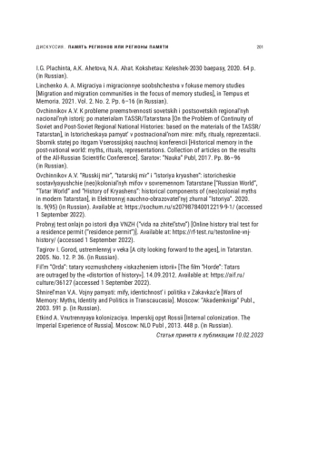 8. Овчинников А.В. “Русский мир”, “татарский мир” и “история кряшен”: исторические составляющие (нео)колониальных мифов в современном Татарстане // Электронный научно-образовательный журнал “История”. 2020. Вып. 9(95). URL: https://sochum.ru/s207987840012219-9-1/ (дата обращения - 1 сентября 2022 г.). EDN: HKLAER