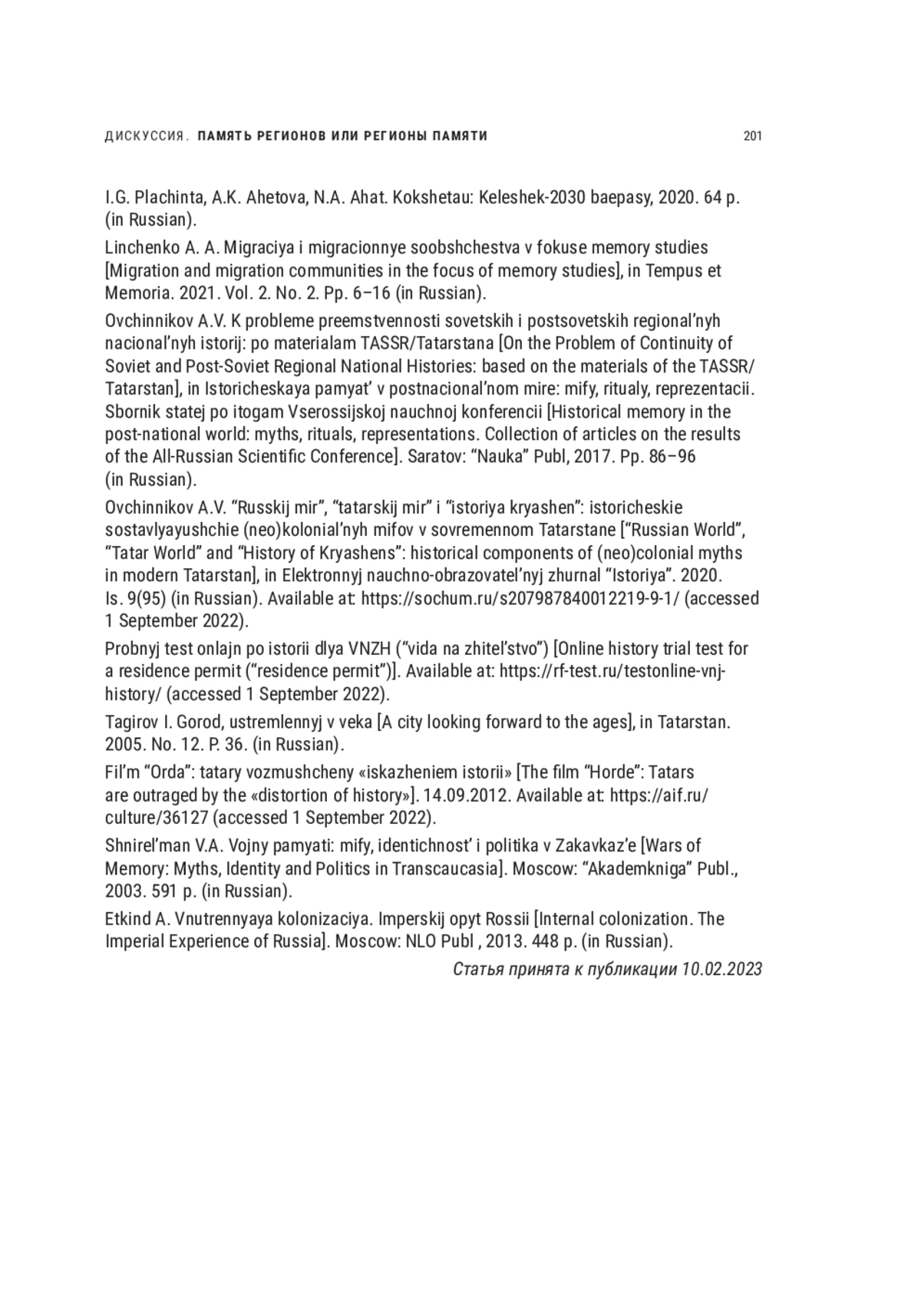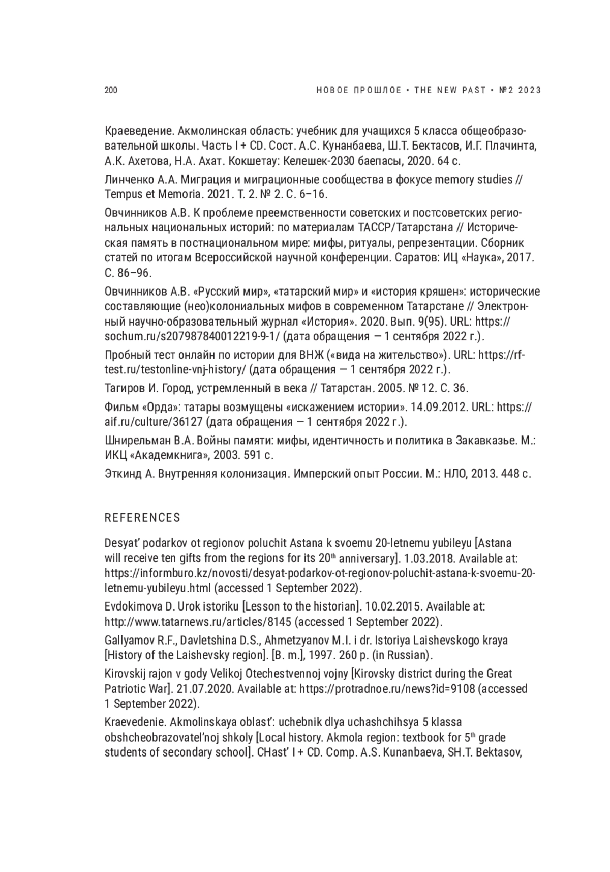 7. Овчинников А.В. К проблеме преемственности советских и постсоветских региональных национальных историй: по материалам ТАССР/Татарстана // Историческая память в постнациональном мире: мифы, ритуалы, репрезентации. Сборник статей по итогам Всероссийской научной конференции. Саратов: ИЦ “Наука”, 2017. С. 86-96. EDN: ZWVBAF