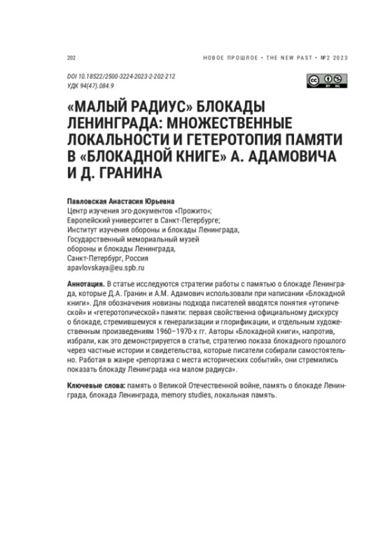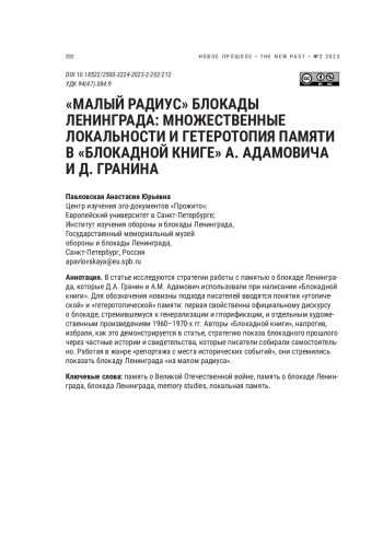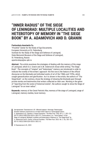 В статье исследуются стратегии работы с памятью о блокаде Ленинграда, которые Д. А. Гранин и А. М. Адамович использовали при написании «Блокадной книги». Для обозначения новизны подхода писателей вводятся понятия «утопической» и «гетеротопической» памяти: первая свойственна официальному дискурсу о блокаде, стремившемуся к генерализации и глорификации, и отдельным художественным произведениям 1960–1970-х гг. Авторы «Блокадной книги», напротив, избрали, как это демонстрируется в статье, стратегию показа блокадного прошлого через частные истории и свидетельства, которые писатели собирали самостоятельно. Работая в жанре «репортажа с места исторических событий», они стремились показать блокаду Ленинграда «на малом радиуса».