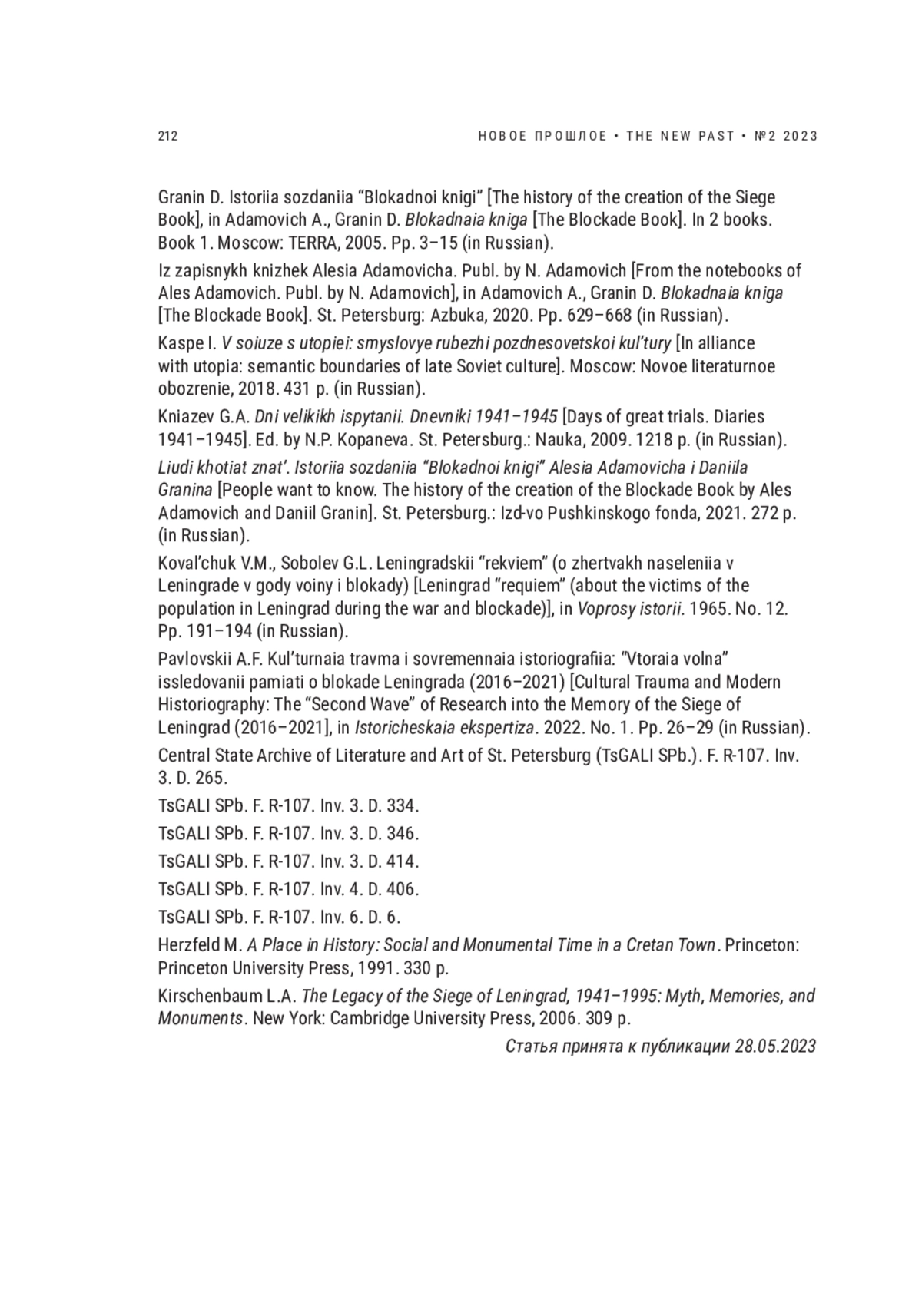 19. Kirschenbaum L.A. The Legacy of the Siege of Leningrad, 1941-1995: Myth, Memories, and Monuments. New York: Cambridge University Press, 2006. 309 p. EDN: YXPITP