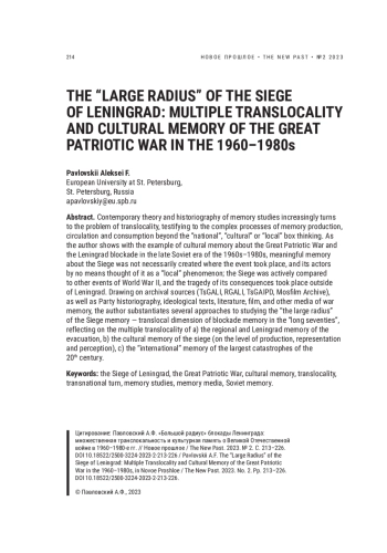 Современная теория memory studies все больше обращается к проблеме транслокальности, свидетельствующей о сложных процессах производства, циркуляции и потребления памяти за пределами «национального», «культурного» или «локального» ящичного мышления. Как показывает автор на примере культурной памяти о Великой Отечественной войне и блокаде Ленинграда в позднесоветскую эпоху 1960–1980-х гг., значимая память о блокаде необязательно создавалась там, где происходило это событие, а ее акторы отнюдь не мыслили ее как «локальный» феномен; блокада активно сравнивалась с другими событиями войны, а трагедия ее последствий происходила далеко за пределами города. Основываясь на архивных источниках (ЦГАЛИ, РГАЛИ, ЦГАИПД, архив «Мосфильма»), партийной историографии, идеологических текстах, литературе, кино и других посредниках памяти, автор обосновывает несколько подходов того, как можно изучать «большой радиус» памяти о блокаде — транслокальное измерение памяти о войне в «долгие семидесятые», выраженное во множественной транслокальности а) памяти об эвакуации, б) культурного производства, репрезентации и восприятия, а также в) «международной» памяти одной из самых масштабных катастроф XX в
