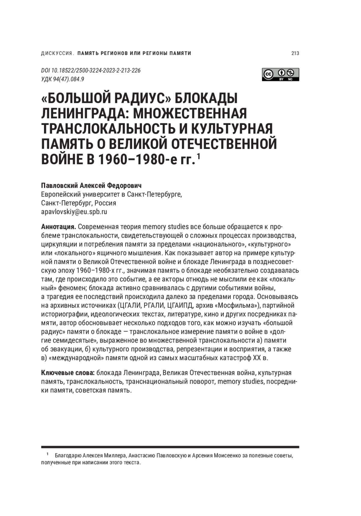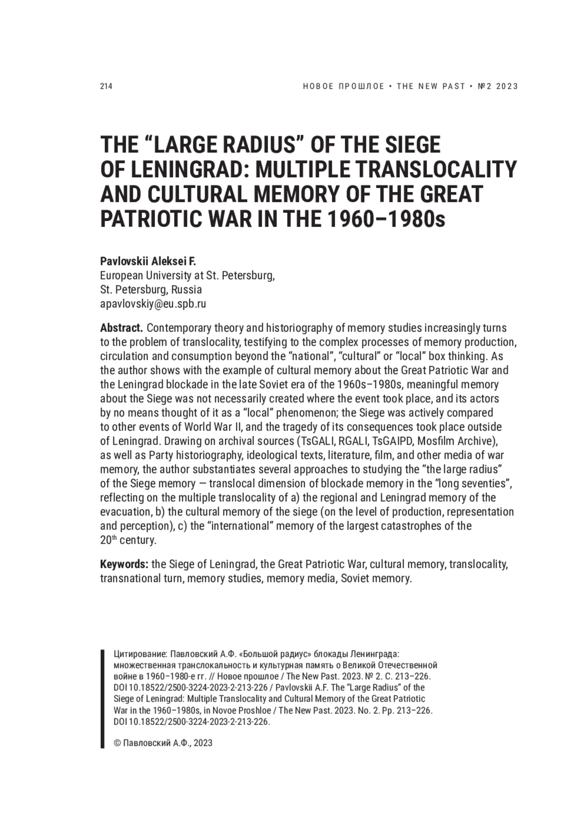 Память о блокаде Ленинграда 1941–1944 гг. — транслокальный феномен. Важная для Санкт-Петербурга [Павловская, 2023b, с. 110–118], эта память не замыкается в его пределах. В 2014 г. Д. Гранин произносит знаменитую речь в Бундестаге. Фильм «Дылда» получает приз на Каннском кинофестивале. Шоураннер «Игры престолов» пишет о блокаде популярный роман. Акция «Блокадный хлеб» проходит по всей России, а «диаспоры» блокадников в Америке, Франции, Германии и Израиле празднуют 27 января 1944 г. как «День Победы для ленинградцев» [Гаргянц, 2022]. Память о блокаде живет поверх границ, однако справедливо ли это для советского времени? Можем ли мыслить советскую память о блокаде транслокально? И что это может дать для понимания памяти войне в целом?