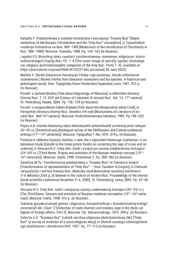 51. Dmitriev M. Le confessionel et l’“ethnique” dans la construction des discours proto-nationaux en Russie Moscovite aux XVIe-XVIIe siècles // Istina. Vol. 50 (2005). № 2. Рp. 137-162.