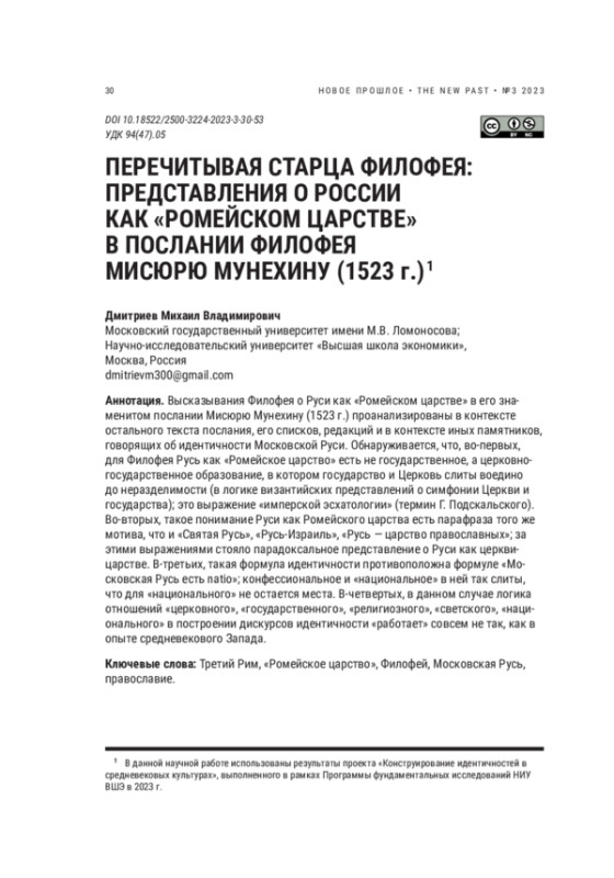 Настоящая статья обращена к вопросам, порождаемым внимательным и свободным от априорных допущений прочтением того, как в знаменитом послании старца Филофея Мисюрю Мунехину звучит мотив приравнения Русского государства к «Ромейскому царству». Что именно стоит за понятием «Ромейское царство» в этом послании? Соответственно, в каком именно смысле Русское государство было, согласно Филофею, «Ромейским царством»? Как в идеологической и ментальной системе представлений Филофея (и, видимо, его приобщенных к книжной культуре русских современников) о «Ромейском царстве» понималось соотношение светского и религиозного, государственного и церковного в устройстве Московской Руси? Наконец, была ли такая система мышления о Руси как «Ромейском царстве» «национальной», «протонациональной», «этнической»?