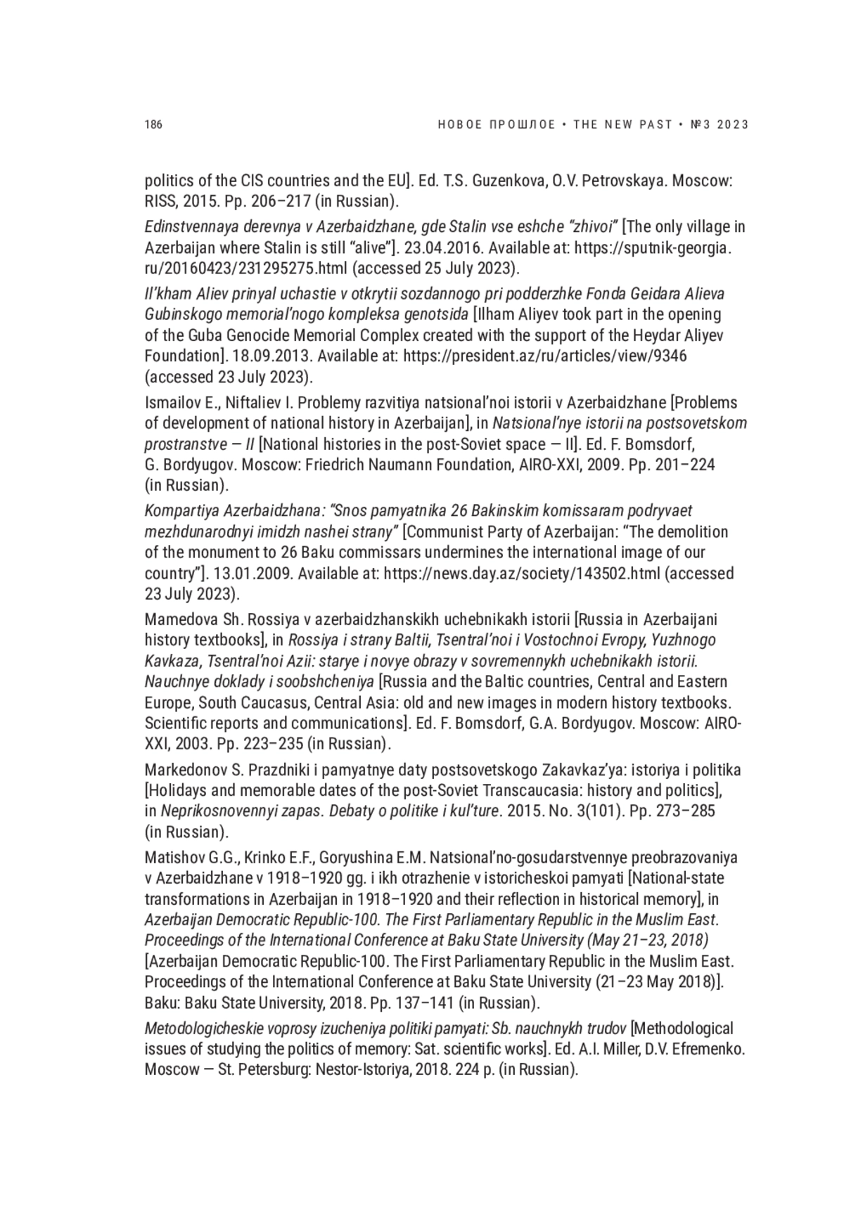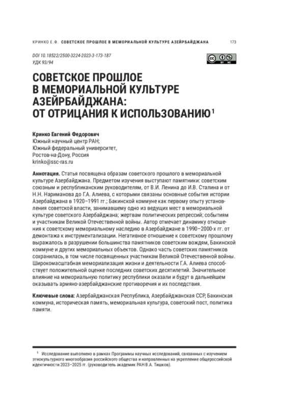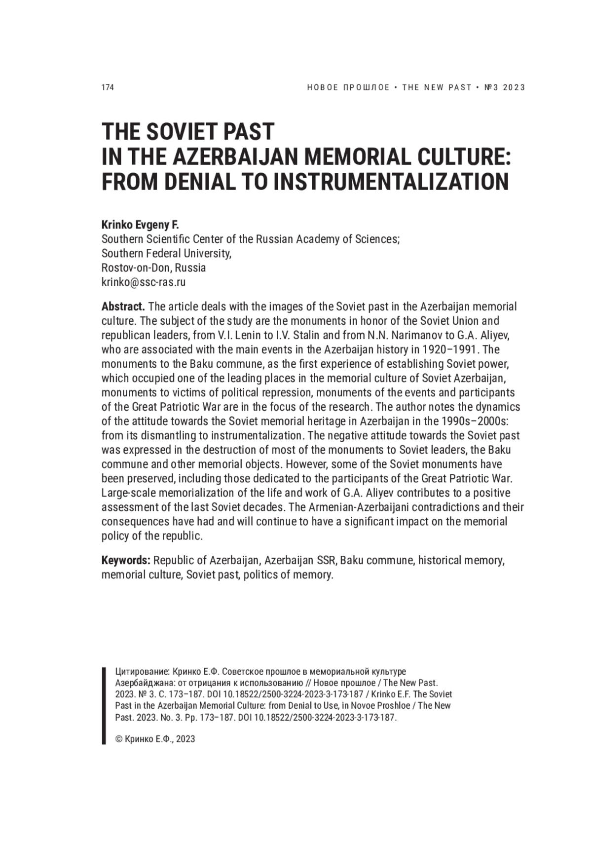 КРИНКО Е. Ф. СОВЕТСКОЕ ПРОШЛОЕ В МЕМОРИАЛЬНОЙ КУЛЬТУРЕ АЗЕРБАЙДЖАНА: ОТ ОТРИЦАНИЯ К ИСПОЛЬЗОВАНИЮ // НОВОЕ ПРОШЛОЕ. 2023. № 3