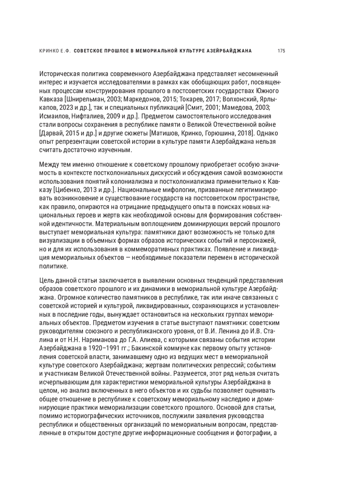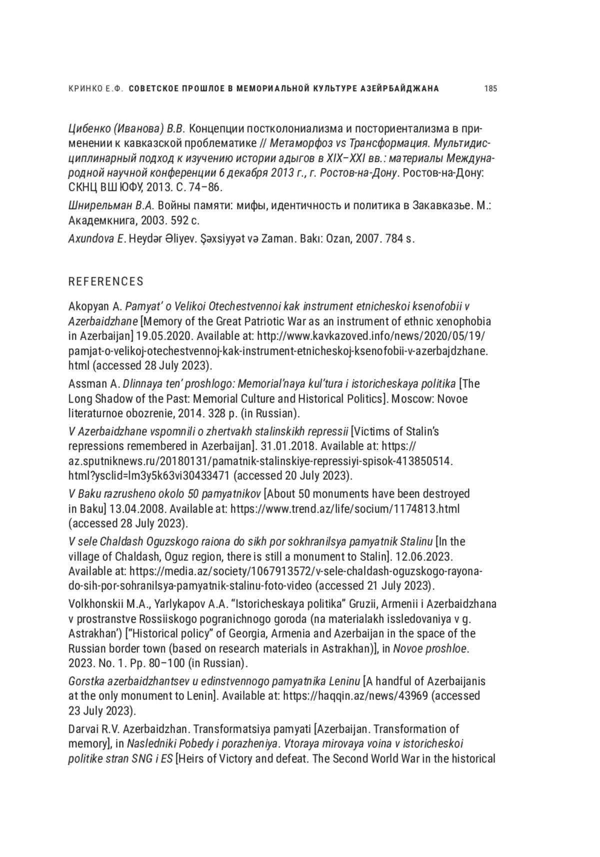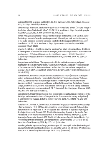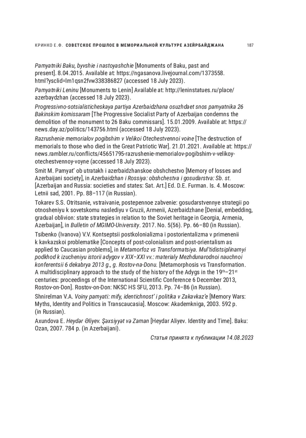 КРИНКО Е. Ф. СОВЕТСКОЕ ПРОШЛОЕ В МЕМОРИАЛЬНОЙ КУЛЬТУРЕ АЗЕРБАЙДЖАНА: ОТ ОТРИЦАНИЯ К ИСПОЛЬЗОВАНИЮ // НОВОЕ ПРОШЛОЕ. 2023. № 3