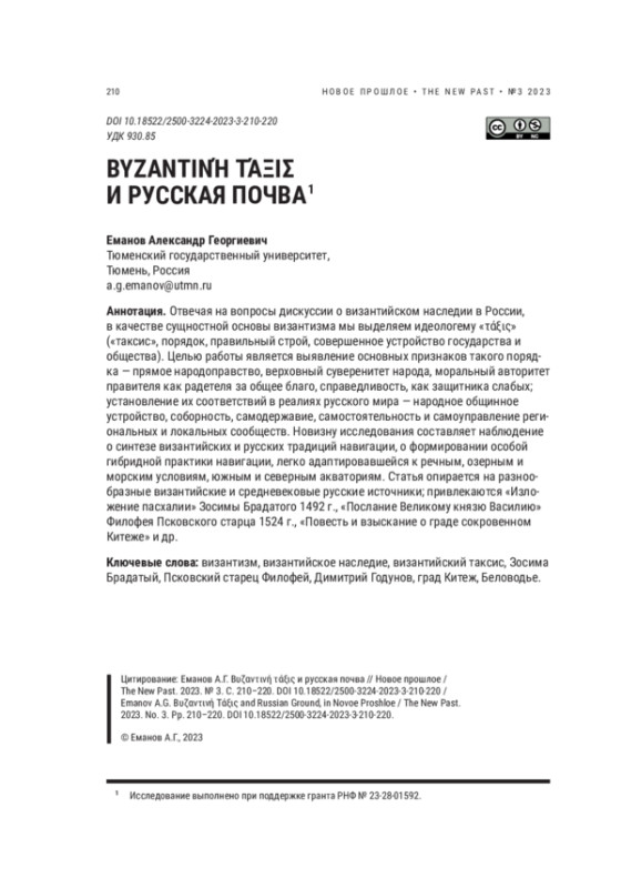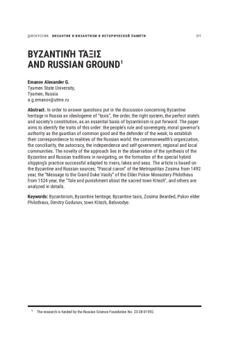 Отвечая на вопросы дискуссии о византийском наследии в России, в качестве сущностной основы византизма мы выделяем идеологему «τάξις» («таксис», порядок, правильный строй, совершенное устройство государства и общества). Целью работы является выявление основных признаков такого порядка — прямое народоправство, верховный суверенитет народа, моральный авторитет правителя как радетеля за общее благо, справедливость, как защитника слабых; установление их соответствий в реалиях русского мира — народное общинное устройство, соборность, самодержавие, самостоятельность и самоуправление региональных и локальных сообществ. Новизну исследования составляет наблюдение о синтезе византийских и русских традиций навигации, о формировании особой гибридной практики навигации, легко адаптировавшейся к речным, озерным и морским условиям, южным и северным акваториям. Статья опирается на разнообразные византийские и средневековые русские источники; привлекаются «Изложение пасхалии» Зосимы Брадатого 1492 г., «Послание Великому князю Василию» Филофея Псковского старца 1524 г., «Повесть и взыскание о граде сокровенном Китеже» и др