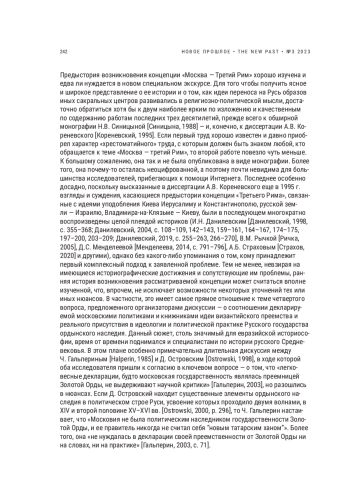 Предыстория возникновения концепции «Москва — Третий Рим» хорошо изучена и едва ли нуждается в новом специальном экскурсе. Для того чтобы получить ясное и широкое представление о ее истории и о том, как идеи переноса на Русь образов иных сакральных центров развивались в религиозно-политической мысли, достаточно обратиться хотя бы к двум наиболее ярким по изложению и качественным по содержанию работам последних трех десятилетий, прежде всего к обширной монографии Н. В. Синицыной [Синицына, 1988] — и, конечно, к диссертации А. В. Кореневского [Кореневский, 1995]. Если первый труд хорошо известен и давно приобрел характер «хрестоматийного» труда, с которым должен быть знаком любой, кто обращается к теме «Москва — третий Рим», то второй работе повезло чуть меньше.