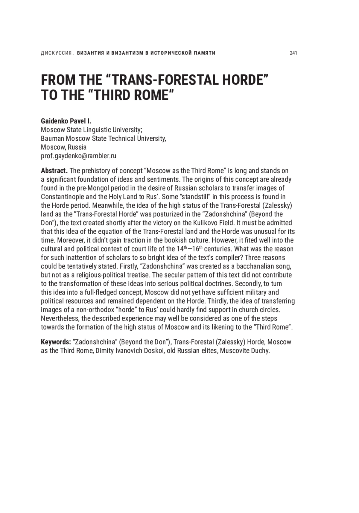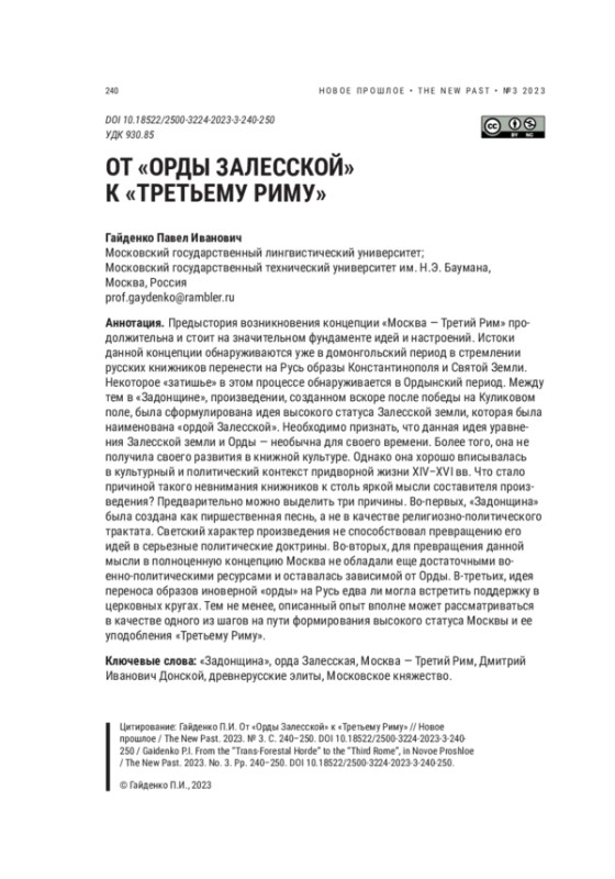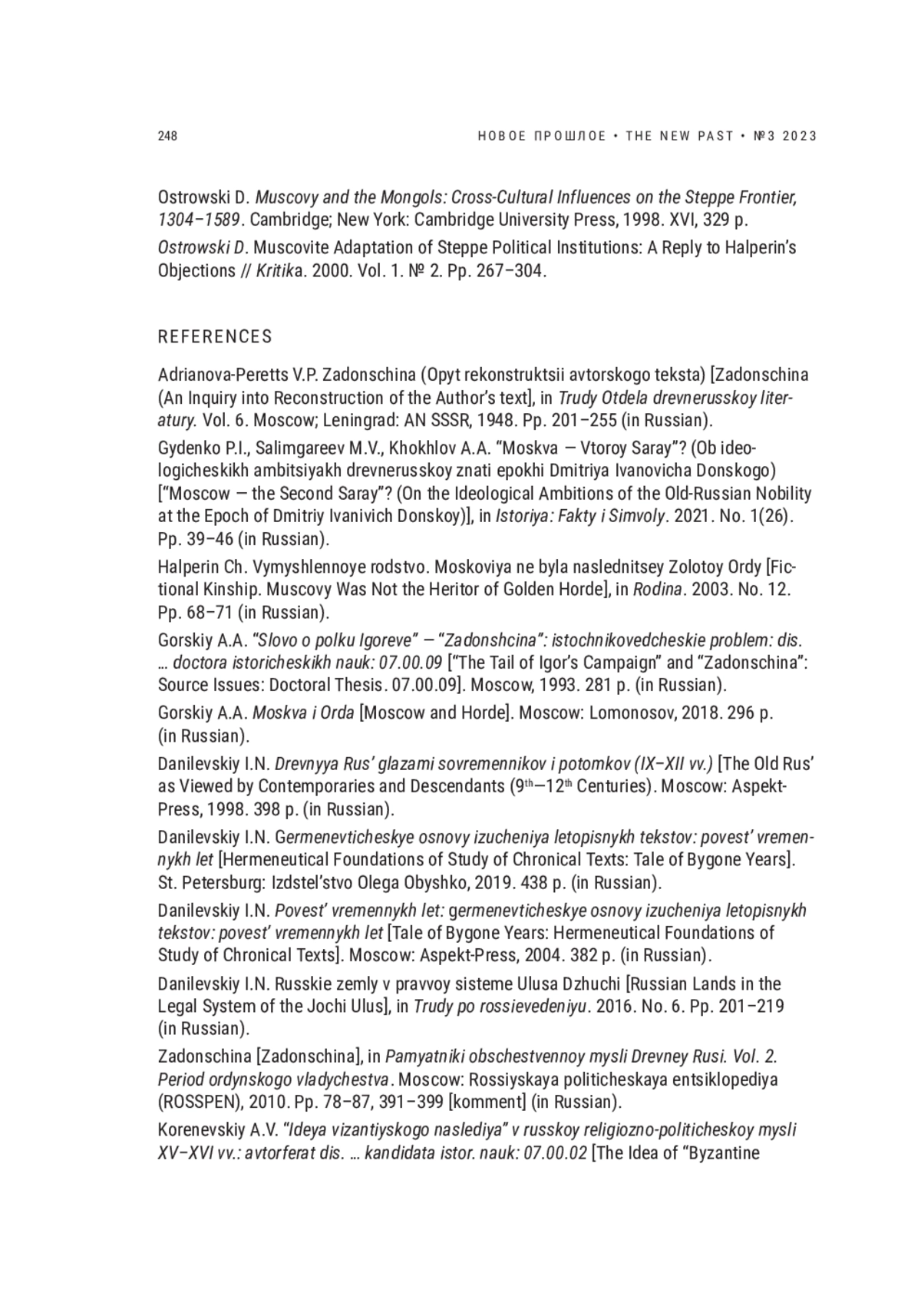 2. Гайденко П. И., Салимгареев М. В., Хохлов А. А. “Москва - Второй сарай”? (Об идеологических амбициях древнерусской знати эпохи Дмитрия Ивановича Донского // История: факты и символы. 2021. № 1 (26). С. 39-46. EDN: PMOXBO