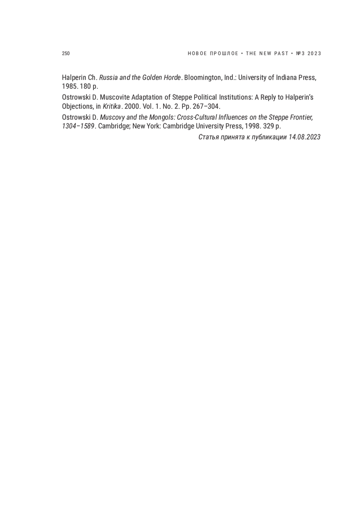28. Ostrowski D. Muscovite Adaptation of Steppe Political Institutions: A Reply to Halperin’s Objections // Kritika. 2000. Vol. 1. № 2. Pр. 267-304.